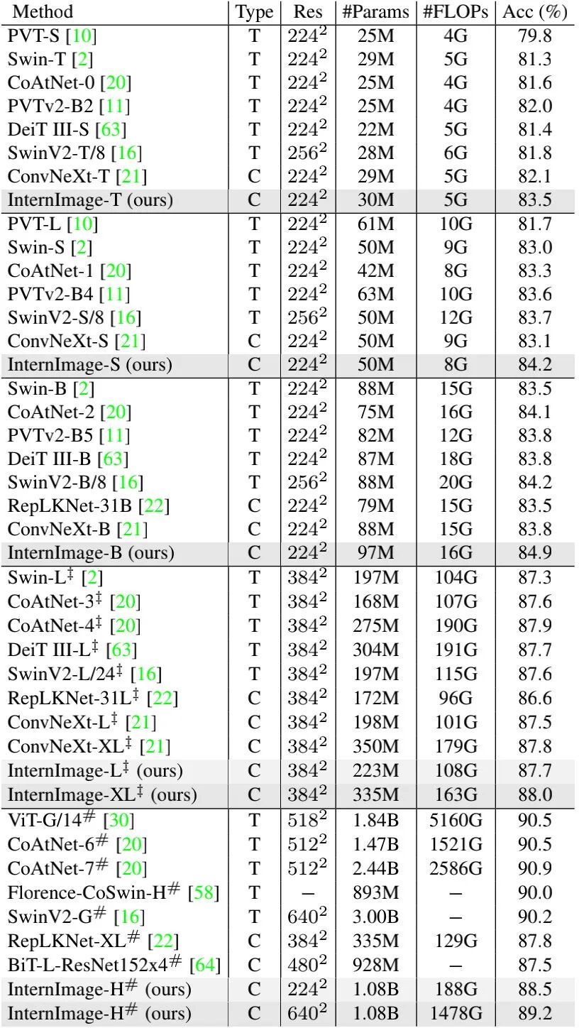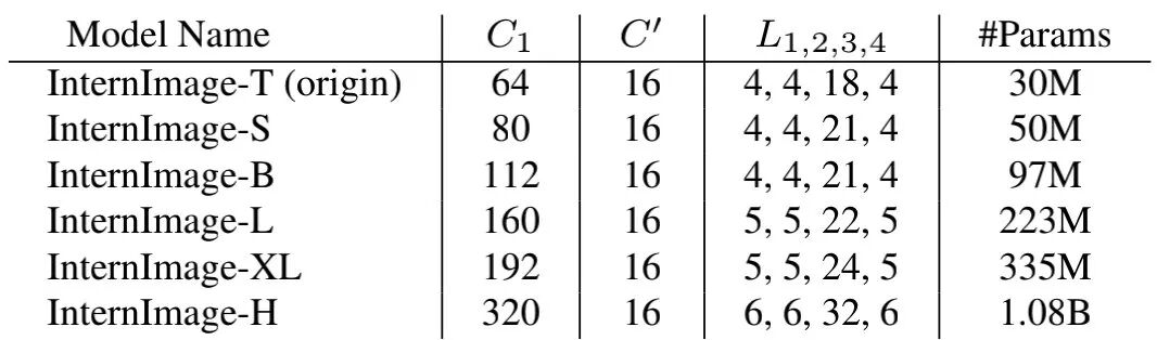 。基于此,作者构建了不同尺寸的InternImage模型,相关参数详见下表。为进一步探索模型容量,作者还构建了具有1B参数量的InternImage-H。