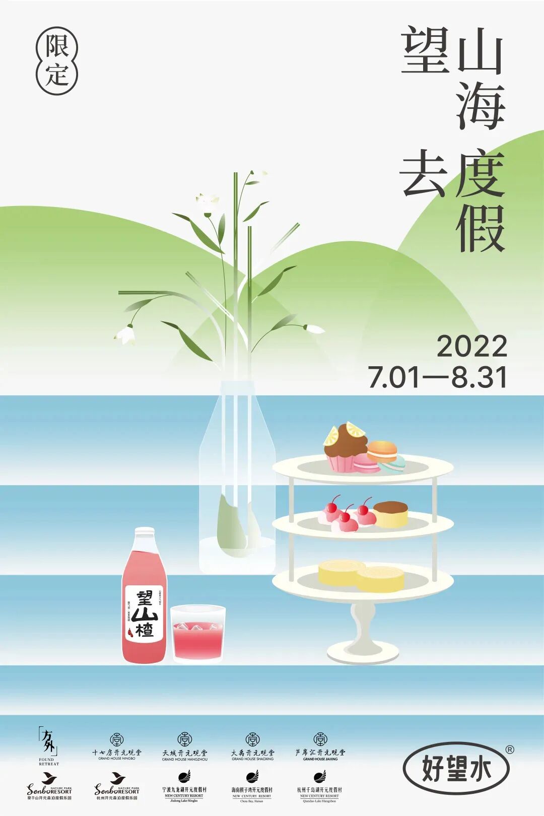 好望水近日联合开元旅业十家度假酒店:杭州富春方外酒店、天域开元观堂、开元森泊度假乐园、千岛湖开元度假村;莫干山开元森泊度假乐园;宁波十七房开元观堂、九龙湖开元度假村;嘉兴芦席汇开元观堂;绍兴大禹开元观堂;海南棋子湾开元度假村。每家度假酒店在7月1日-8月31日配备不同的下午茶菜单,品牌希望让消费者在酷热焦躁之际,能择一处自然之地,在静谧悠然的环境之中抚平灼热的思绪。(来源:官方微信公众号)