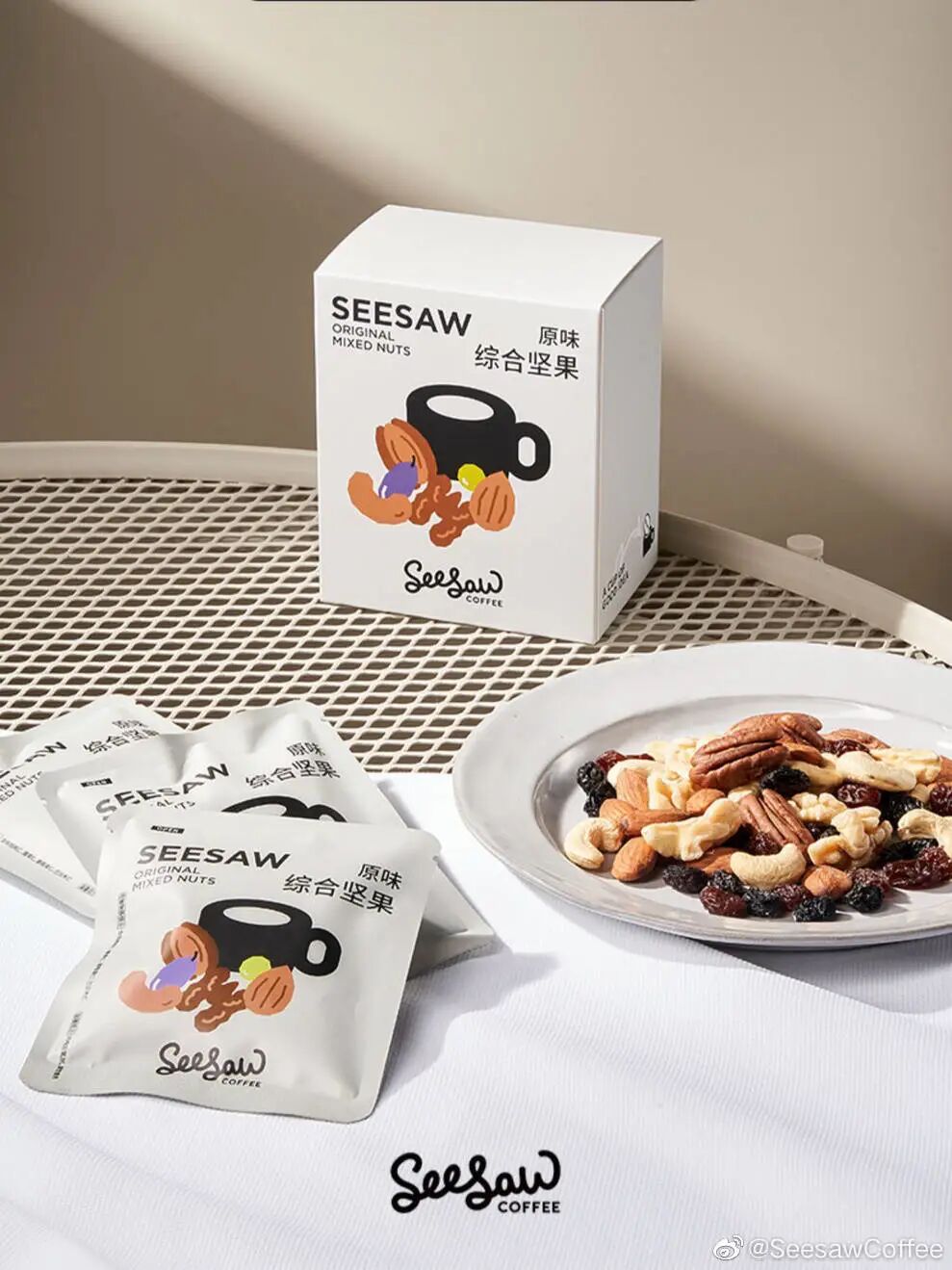咖啡品牌Seesaw近日推出坚果系列产品,共有原味综合坚果、益生菌枫糖腰果两款产品。综合坚果内含4种果仁2种果脯,口感丰富;益生菌枫糖腰果精选优质腰果仁,包裹低甜枫糖浆,特别添加多种活性益生菌,满足日常营养需求。(来源:官方微博)