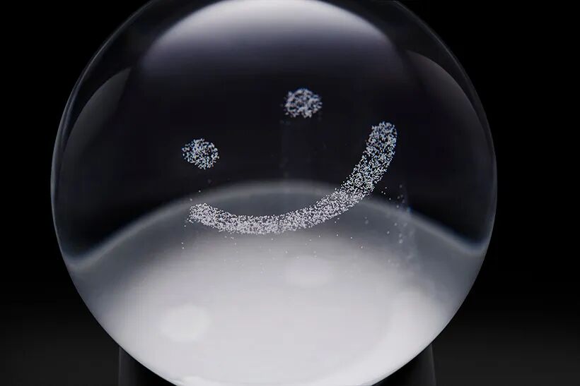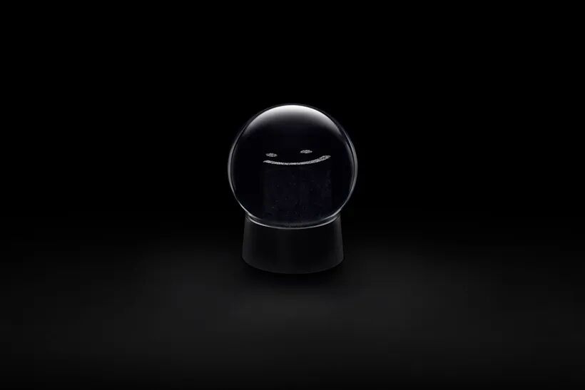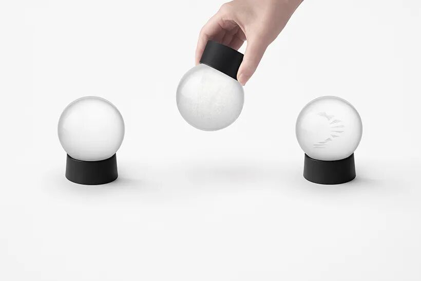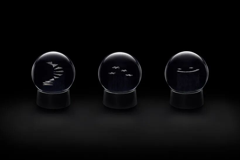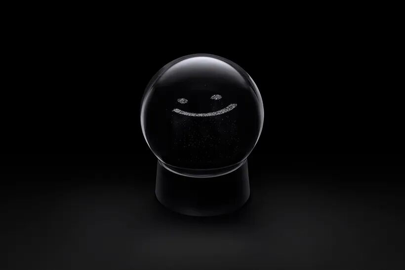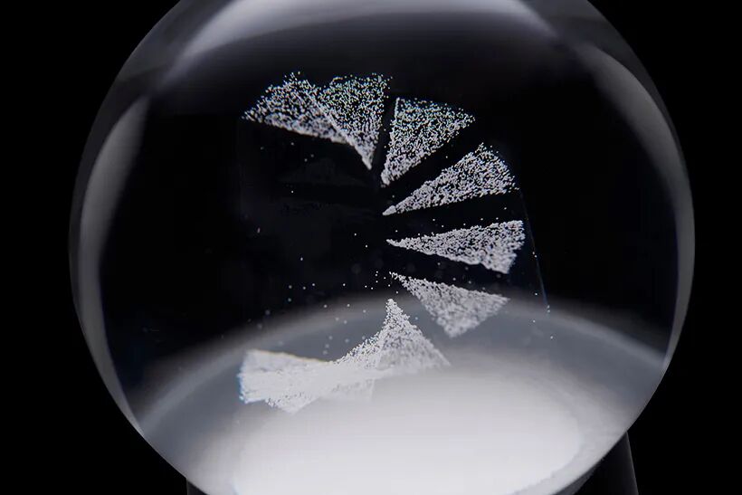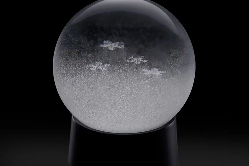 Immediately after shaking the snow globe, nothing else is visible other than the falling snow. As the snow slowly piles up, a vague outline begins to appear. When the snow is completely piled up, the motif emerges clearly in white, and the lower part of the object without snow looks like its shadow.
