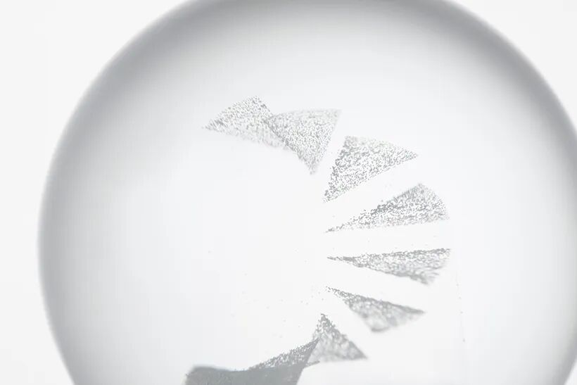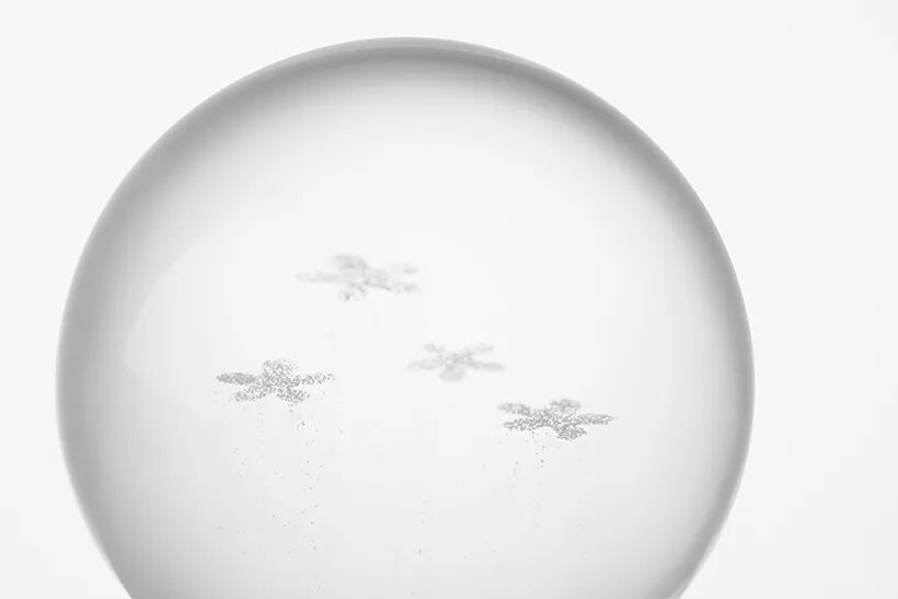 Generally, water-diluted glycerin is used to allow the particles in the snow globe to flutter slowly, with a refractive index of approximately 1.333 to 1.475. By creating an object using an ultra-transparent silicone resin with a refractive index as close as possible to this value, its form disappears.