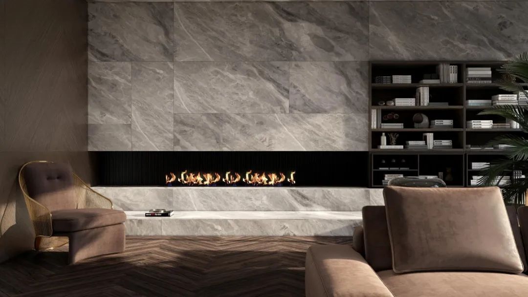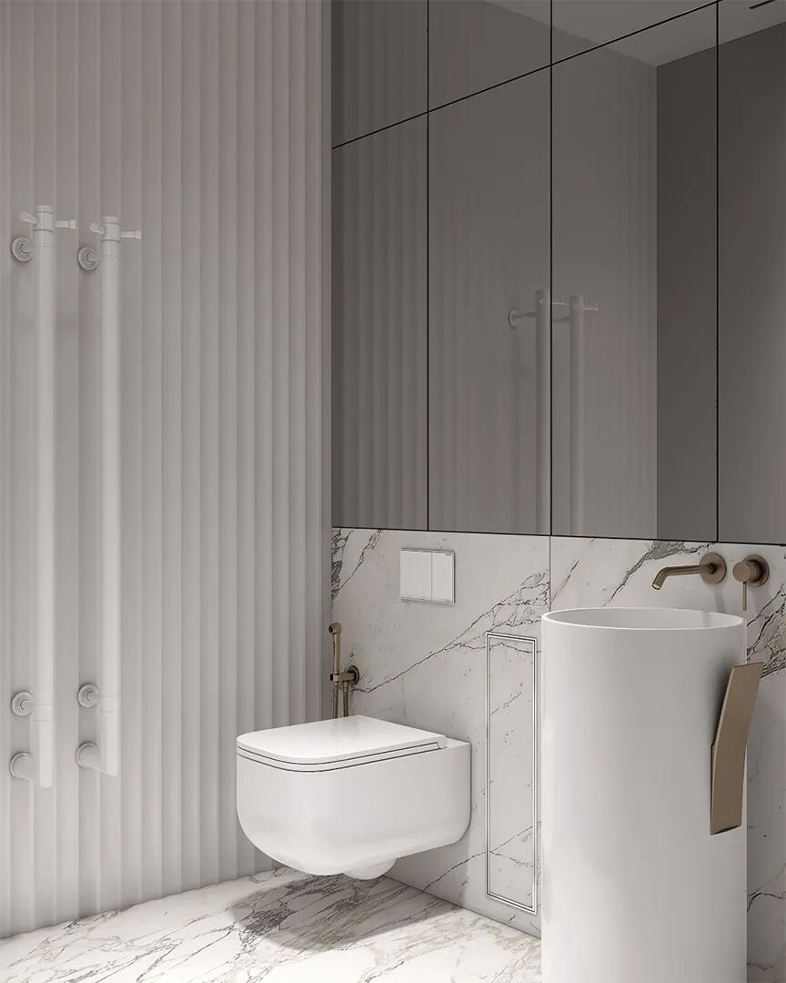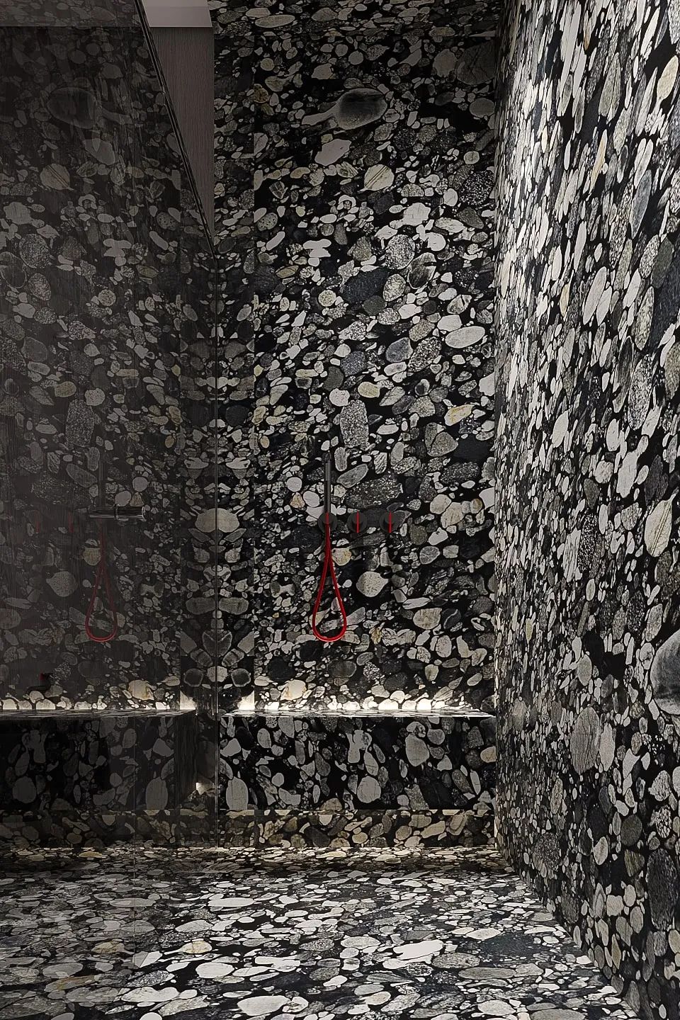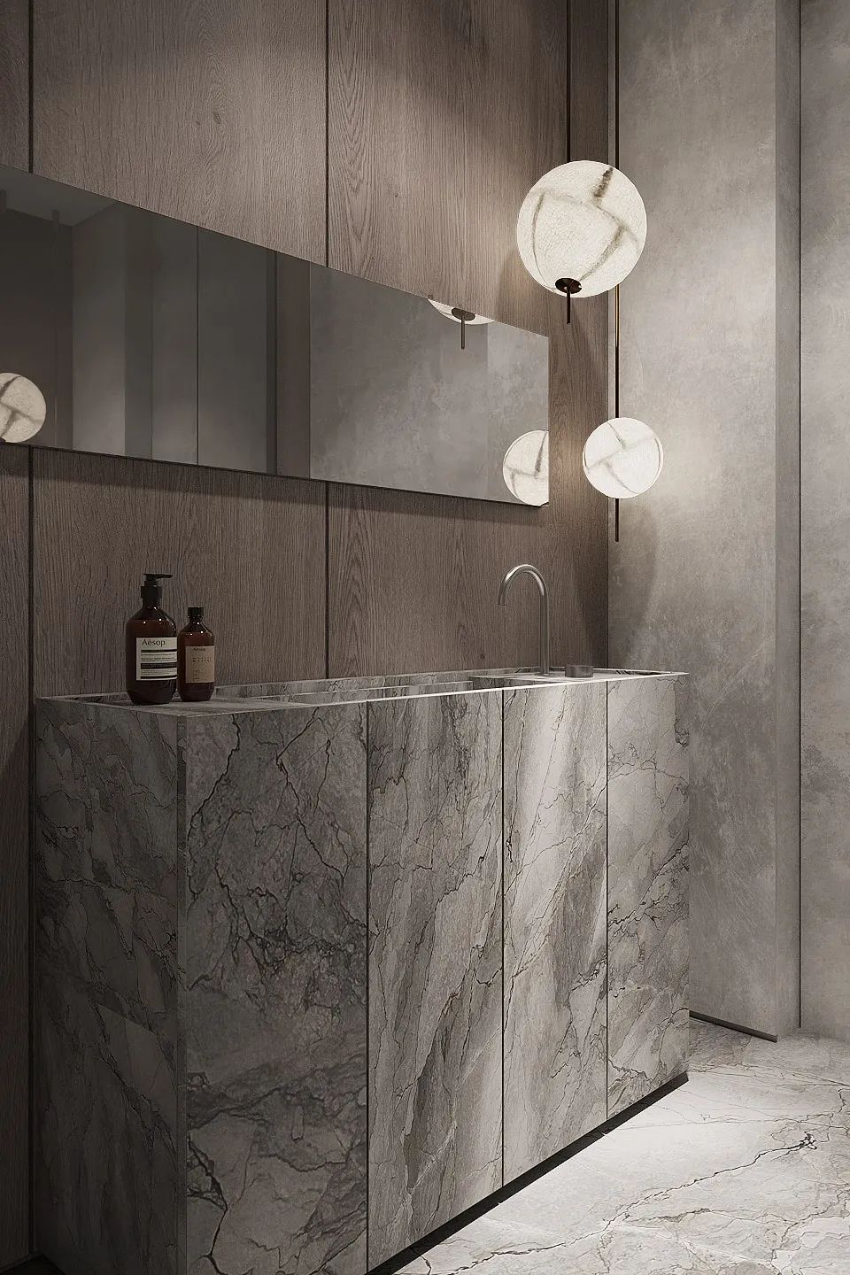 主卫采用大面积石纹背景,极其的夸张,墙壁的花纹渲染了这一整个灰色空间,有着十分强烈的质感,精巧而美观。