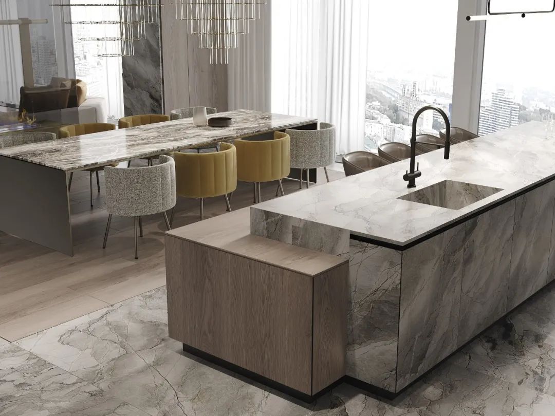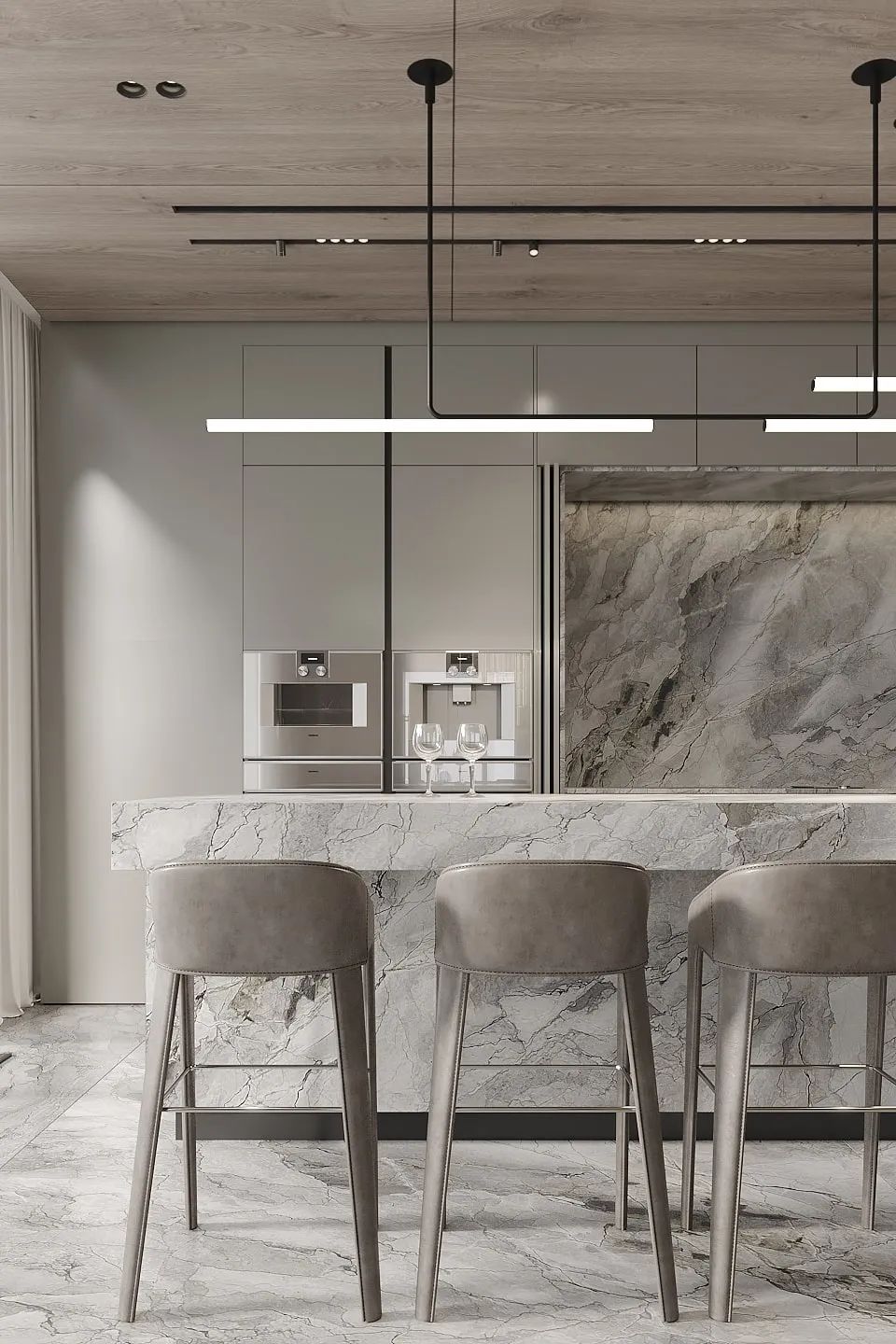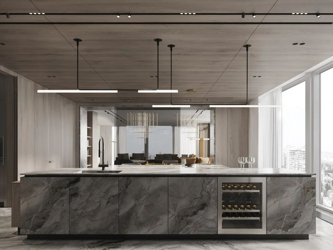 大理石的纹岛台以白色为主,上方的装饰植物和流线清晰的几何设计二者对比明显,空间变得极其柔和,把空间利用的十分合理。还特意做了个吧台,给聚会的朋友荣获一种极佳的体验感。