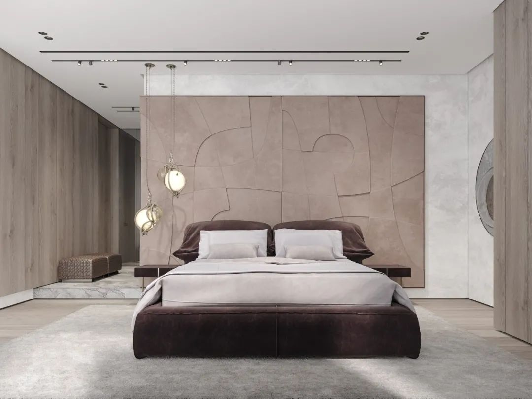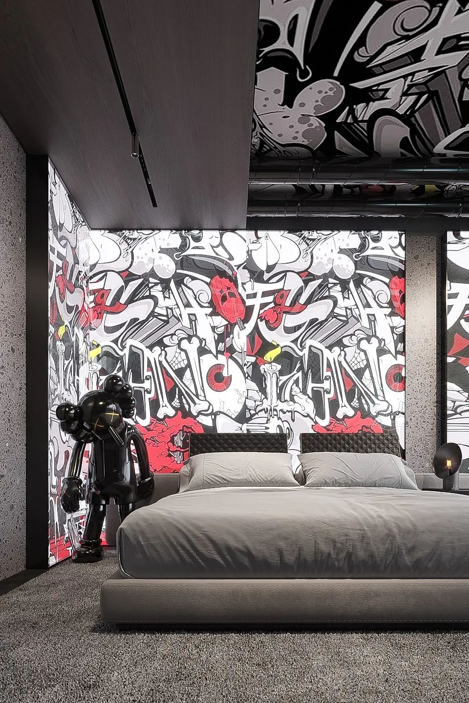 次卧内部色彩十分和谐,床头的背景墙线条式图案采用抽象原理,艺术气息浓烈无比,满满的活力,极其简单的设计风格,渲染出安静的氛围,艺术造艺极高。