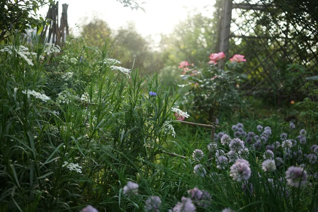 穿过菜地,高高的架子上长满粉色的月季,如同一个瀑布流。四周散落各种植物,高低错落,都充满着生命力和野性。