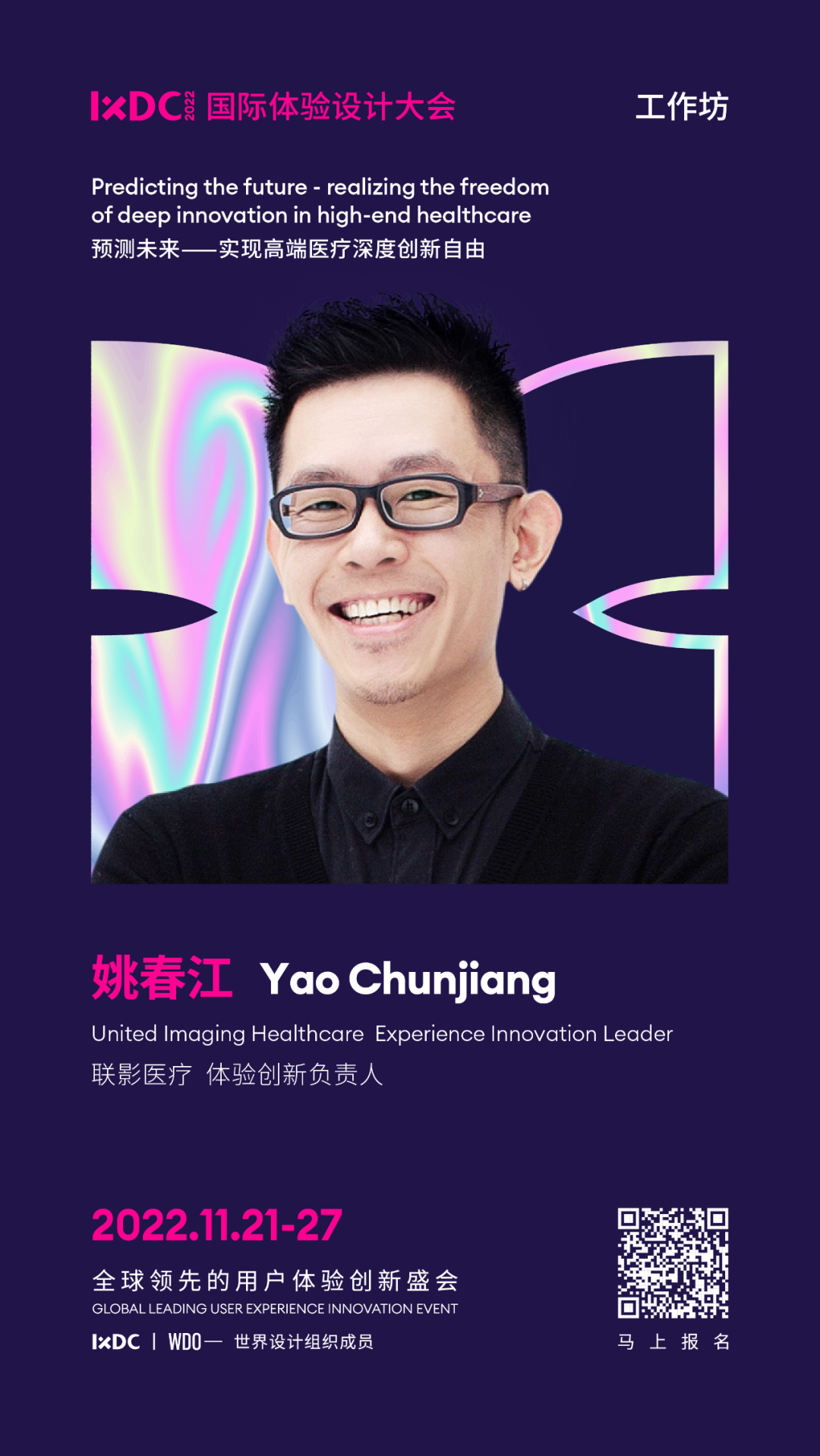 超过16年服务设计一线经验,2012年加入联影医疗,从工业设计到体验创新,以设计的视角深度参与PDP全流程研发,在最严苛的医疗领域持续探索设计的价值最大化。目前担任联影医疗体验创新负责人,多领域跨界技术创新、产学研医联合创新、软硬交互融合创新,多维度全视角推进医疗大健康的整体深度创新升级。
