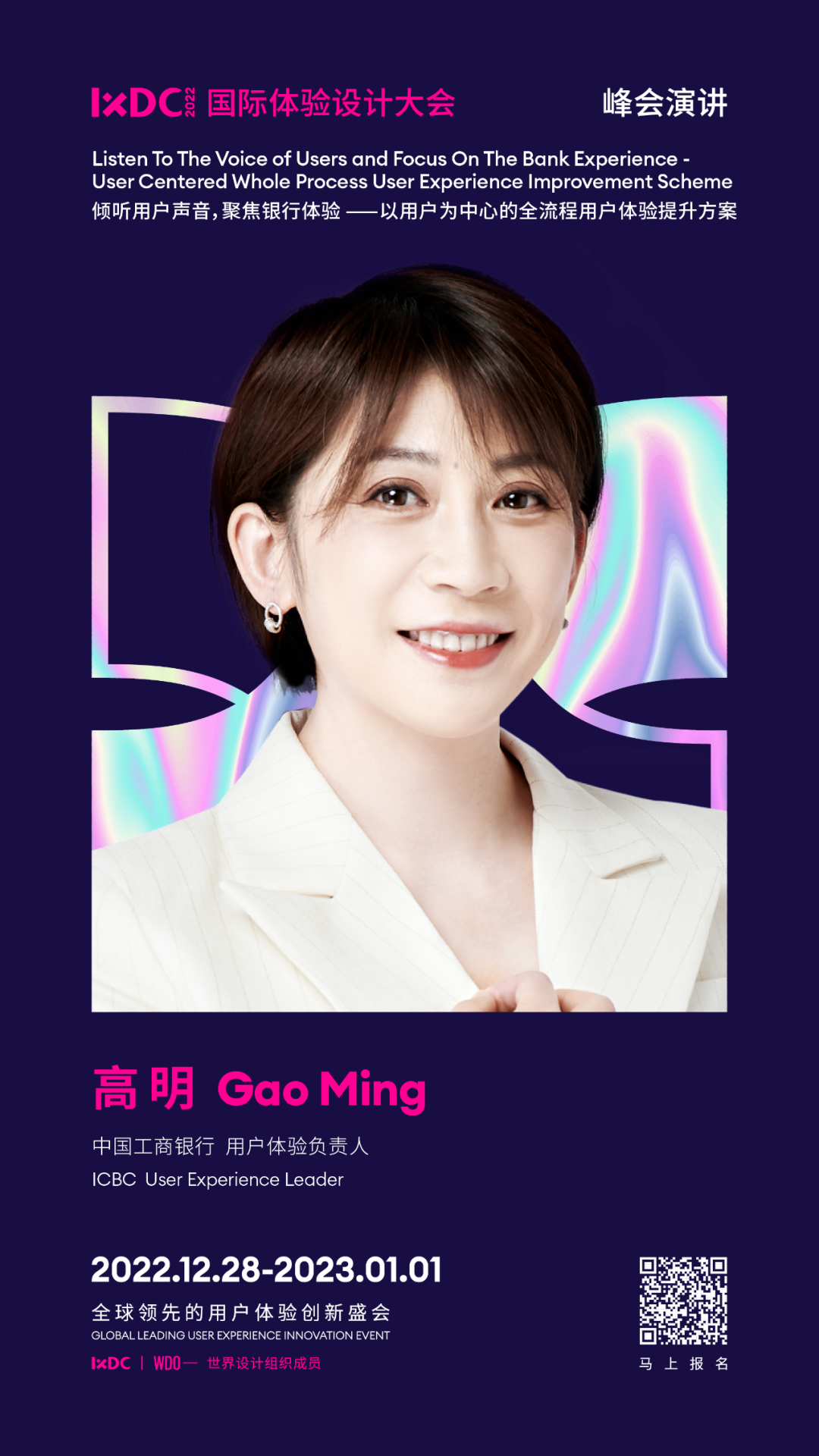 高明女士现任中国工商银行业务研发中心用户体验部总经理,从事金融产品研发工作15年。拥有丰富的项目研发和用户体验设计团队管理经验,面向用户与基层,致力于打造人本、灵动、极致的产品体验,赋能金融产品项目研发及全行体验提升。