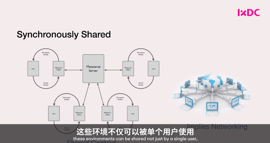 计算机网络链接不同的计算机,可以用同样的方式,让不同的用户连接到这个共享的同步元世界,并意识到其他用户的存在以及他们在做什么,所以大脑几乎会开始相信大家在同一个虚拟位置。让所有不同的元空间彼此同步,这是使元宇宙成为元宇宙的一个关键。