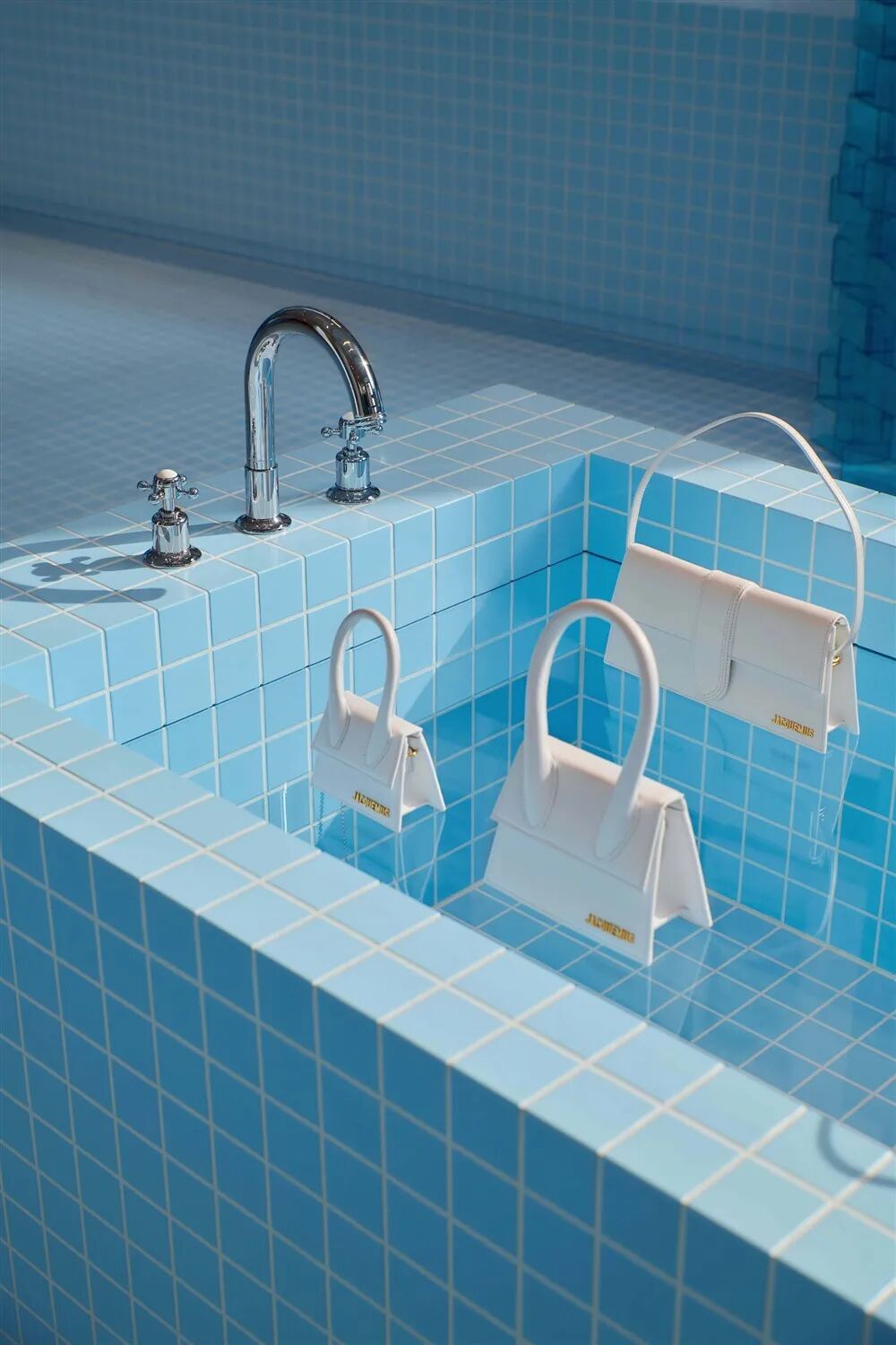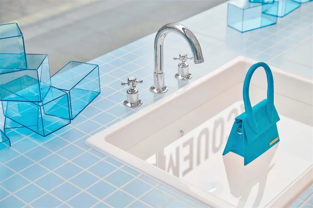 在其新系列LeBleu推出之际,我们为Jacquemus带来了一次多感官体验,在伦敦塞尔弗里奇及其周围展开。结合空间设计和带有气味的交互式场景,我们为游客提供了一个远离日常的难忘假期。我们在三个不同的地点创作了以水为中心主题。部分灵感来自创始人西蒙·波特·杰奎默斯(Simon Porte Jacquemus)收集肥皂的热情,角落店通过超现实主义的镜头重新设计了浴室,日常用品比生活更大。从街上可以看到,橱窗里展示的是一支牙膏管,而入口处的一个巨大的Jacquemus牌扑热息痛药丸在玻璃杯里嘶嘶作响。在新鲜的蓝色瓷砖的背景下,产品陈列在浴缸、淋浴间、水槽和用肥皂制成的高耸墙壁上。