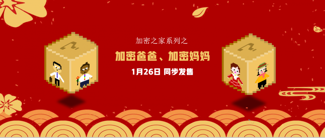 该系列首发款“加密宝宝”此前已于 1 月 4 日开启预售。而在寓意“阖家团圆”的新春佳节即将到来之际,官方也应景地宣布将于 1 月 26 日同步发售加密爸爸与加密妈妈。本次发售的盲盒除了拥有稀有款外,还设置了特色款和隐藏款,顾客买到任何一款都将获得权益赠送。