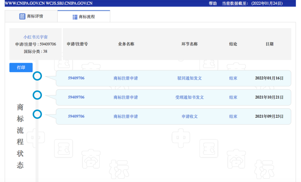 / 中国商标网显示,1 月 16 日,小红书科技有限公司申请注册的“小红书元宇宙”商标流程状态变更为“驳回通知发文”/ 图:截屏自中国商标网