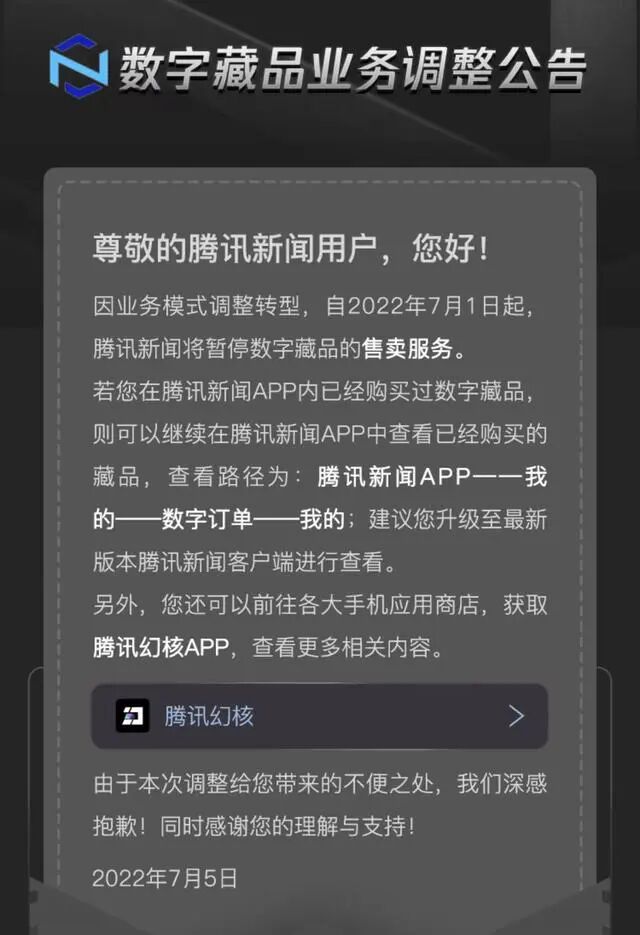 7 月 14 日消息,腾讯新闻已将原有App内的“数字藏品”板块替换为“数字订单”,其《数字藏品业务调整公告》显示,因业务模式调整转型,自 2022 年 7 月 1 日起,腾讯新闻将暂停数字藏品的售卖服务,用户可以在腾讯新闻APP中查看已经购买的藏品。
