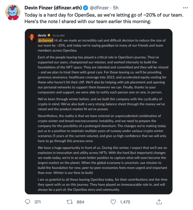 全球目前交易量最大的NFT市场OpenSea的联合创始人兼首席执行官Devin Finzer于 7 月 14 日宣布,该公司将裁员约 20%。OpenSea表示,它将为被裁员工提供“慷慨的遣散费、2023 年的全年医疗保险,以及加速股权归属”。