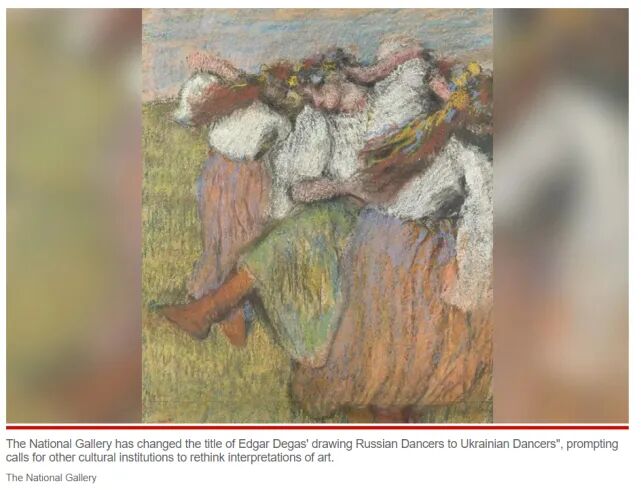 据《纽约邮报》4 日报道,知名画家埃德加·德加(Edgar Degas)的作品《俄罗斯舞者》,在 120 多年后被英国国家美术馆改名为《乌克兰舞者》。