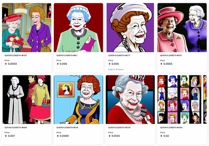 据 9 月 9 日消息,英国女王伊丽莎白二世去世后,基于以太坊的NFT项目“QueenE”举行了最后一次Gen1艺术品拍卖。该项目由 Web3 构建者Fabio Sevá和mladen.eth创建,在过去两个月中制作了数十件向伊丽莎白二世女王致敬的艺术品。为了纪念英国女王去世,该系列宣布举办此次为最后一场拍卖,之后将不再进行拍卖,同时该项目还将其社交媒体简介修改为“永远在以太坊中安息”。