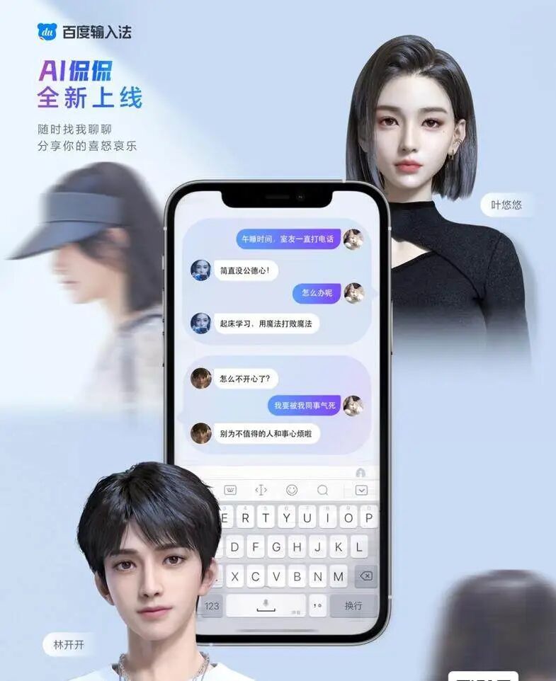 8 月 17 日,百度输入法正式推出国内首款情感陪伴型虚拟博主——林开开和叶悠悠,他们将在百度输入法的AI侃侃功能上,为超 6 亿用户提供 24 小时在线陪伴、拟人化聊天、情绪治愈等服务,支持文字、语音、表情包聊天互动,并拥有专属叫早、哄睡等好友体验。