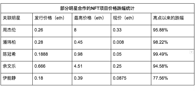 部分明星合作的NFT项目价格跌幅 / 图源:根据财联社所发图片整理