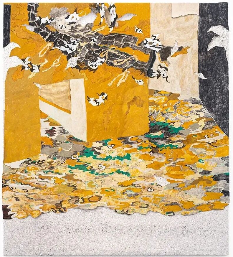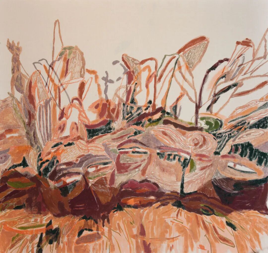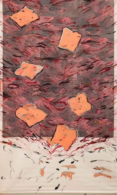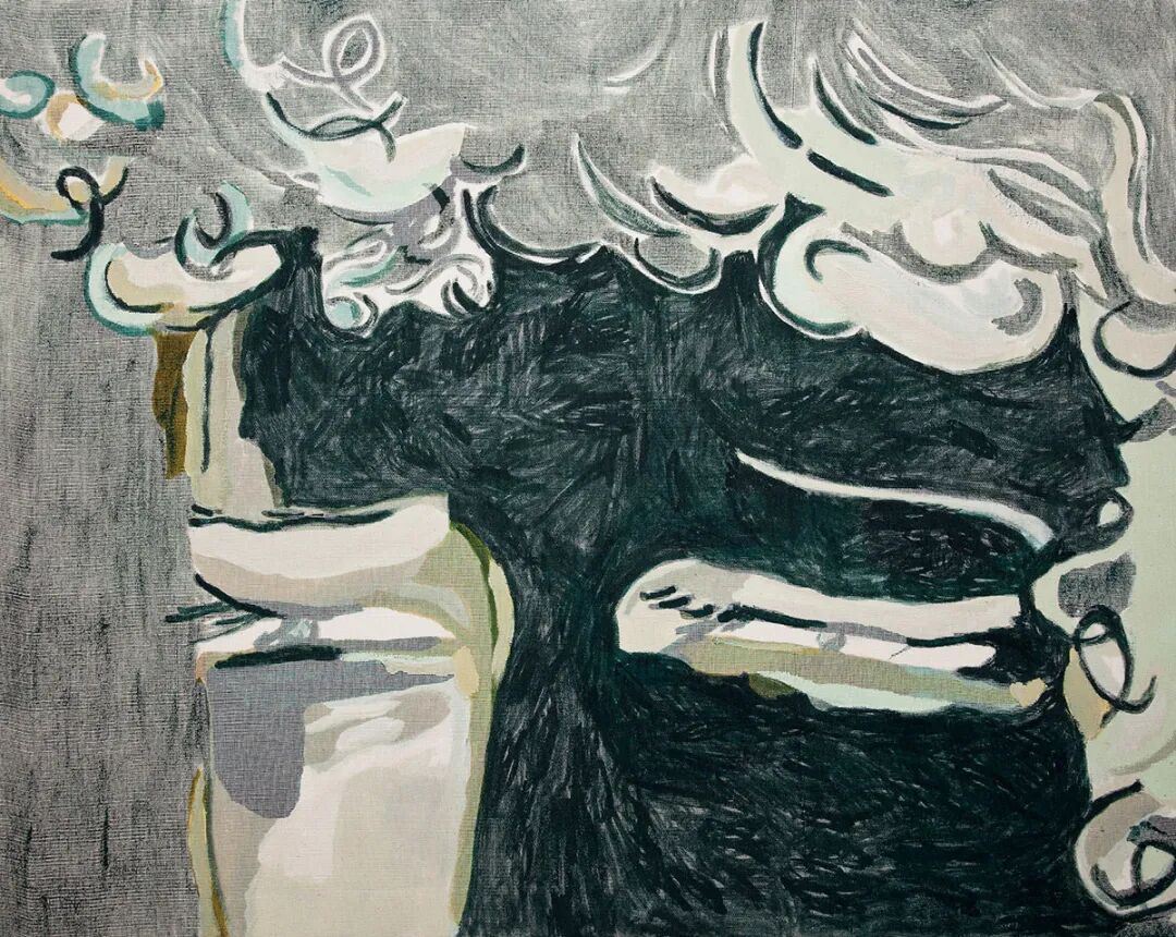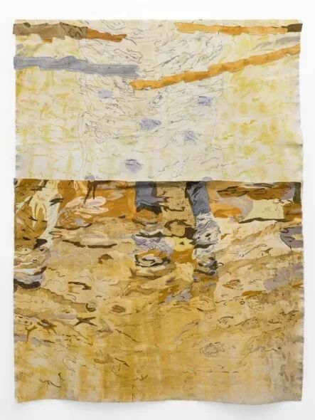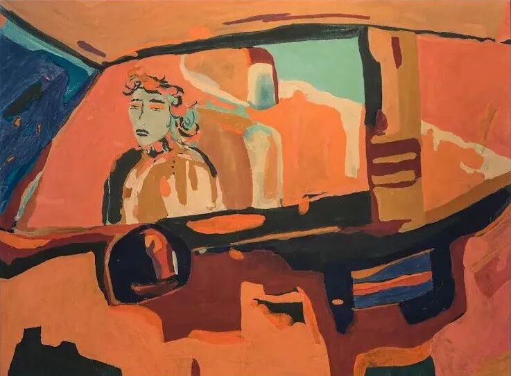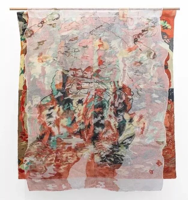 珍妮·盖格尔的作品目前选择的媒介是丙烯酸涂料,她的日常照片被用作画布和网格布作品的视觉参考,甚至用作画布本身。她在具象和抽象之间灵活移动,专注于混合区域一起改变形状和大小,并朝着意想不到的方向生长。物体通过轨迹和能量线传播,没有明确的边界。她的作品似乎形成了一种梦境逻辑,其中绘画溶解在流动性空气中。