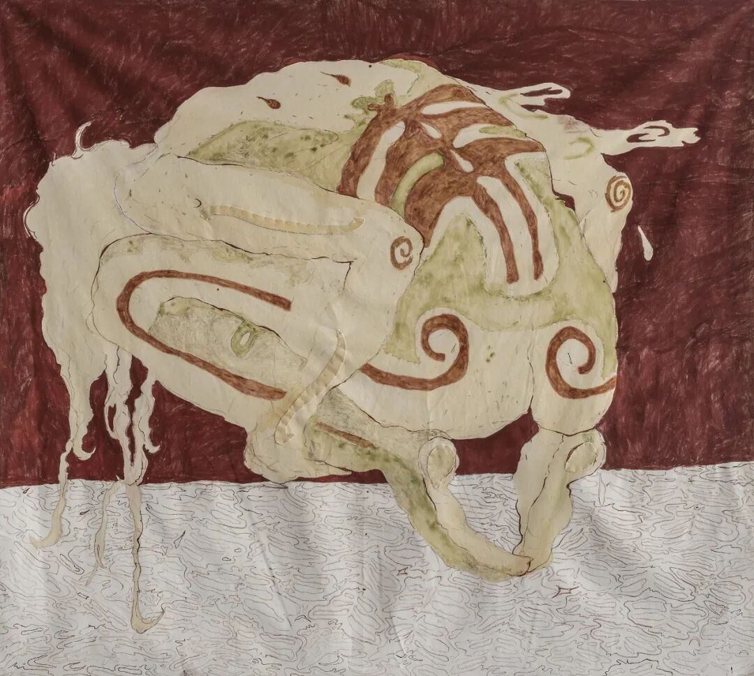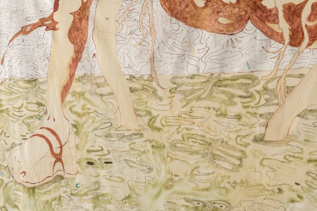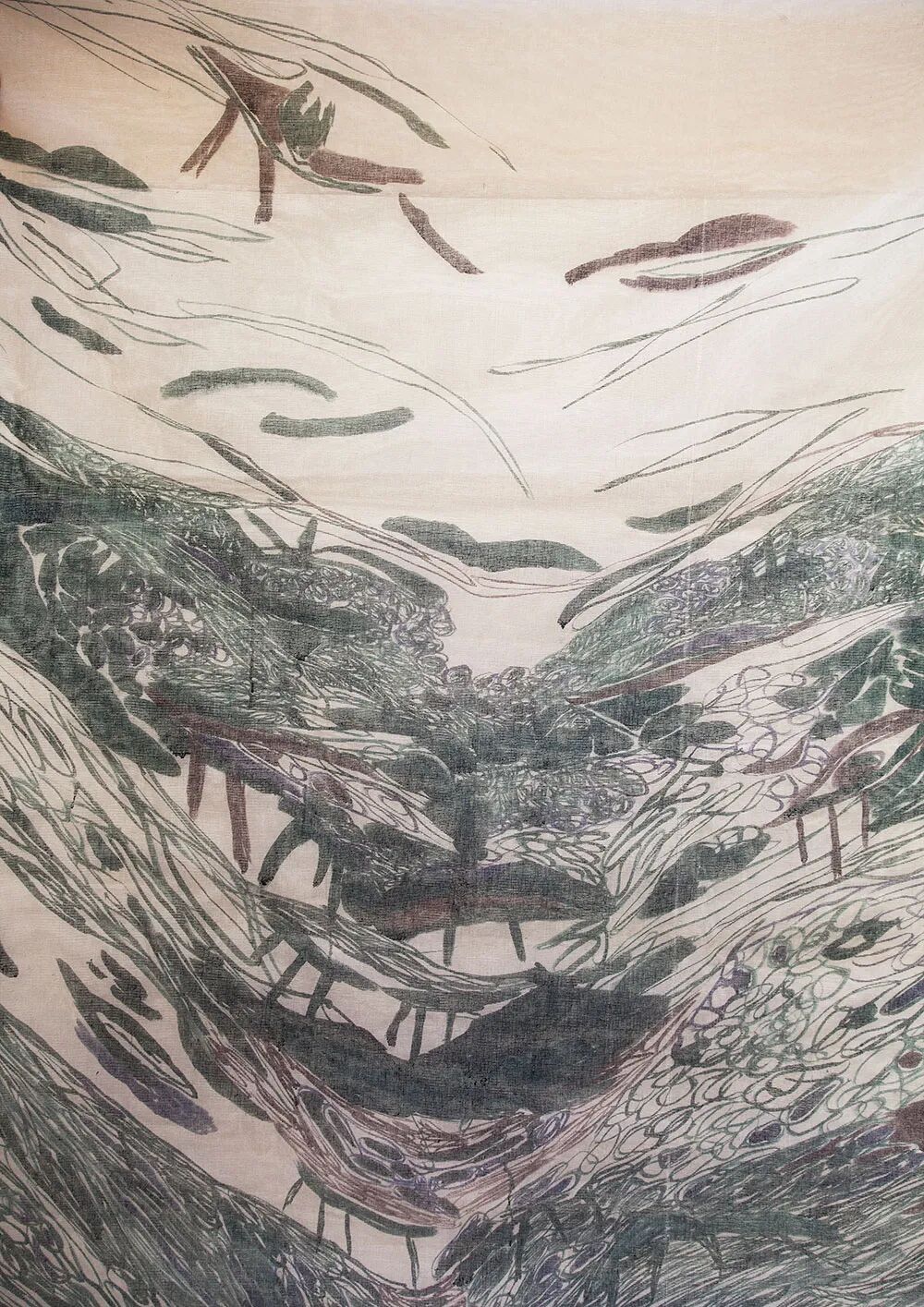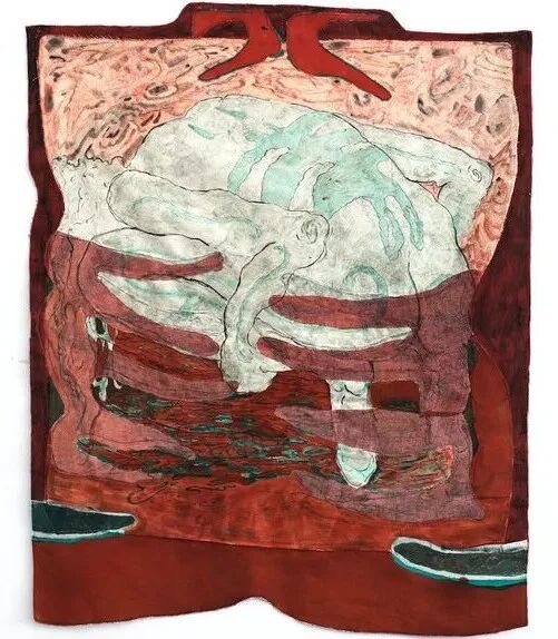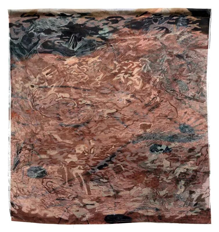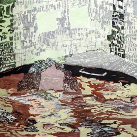 珍妮·盖格尔的作品目前选择的媒介是丙烯酸涂料,她的日常照片被用作画布和网格布作品的视觉参考,甚至用作画布本身。她在具象和抽象之间灵活移动,专注于混合区域一起改变形状和大小,并朝着意想不到的方向生长。物体通过轨迹和能量线传播,没有明确的边界。她的作品似乎形成了一种梦境逻辑,其中绘画溶解在流动性空气中。
