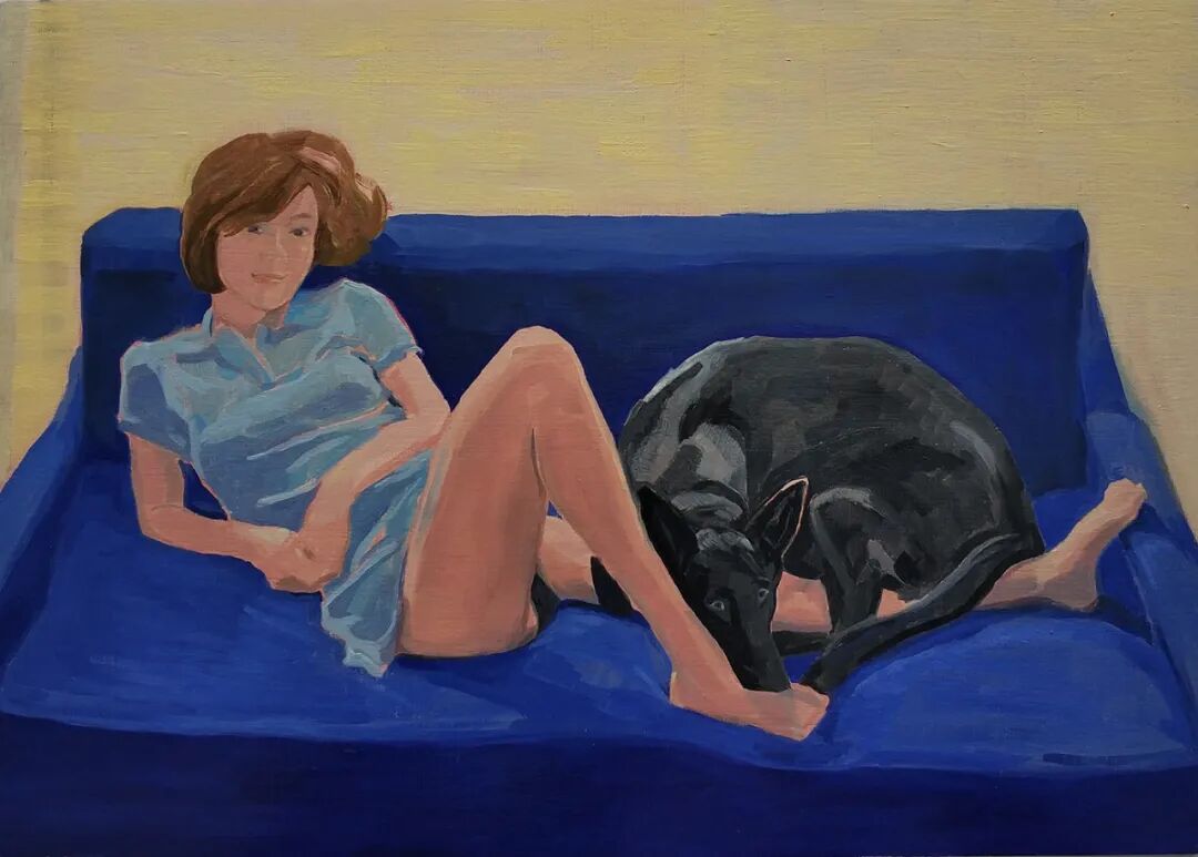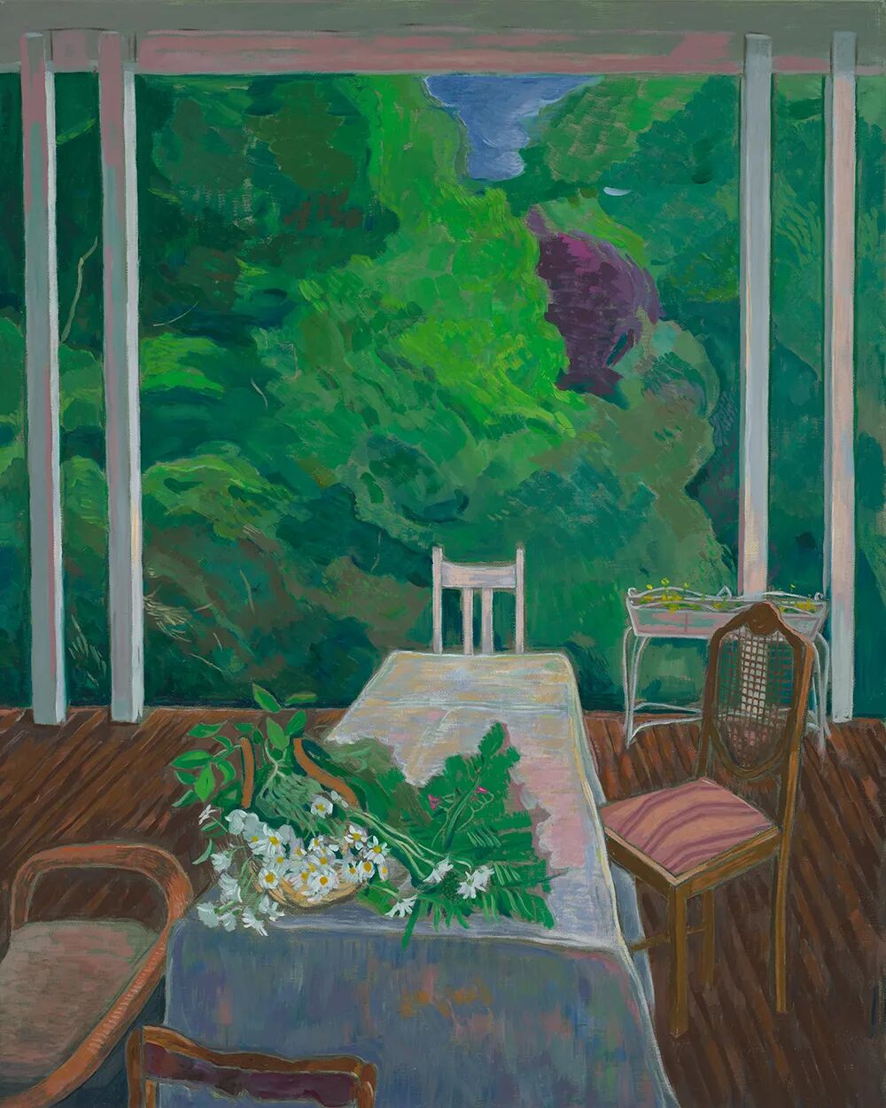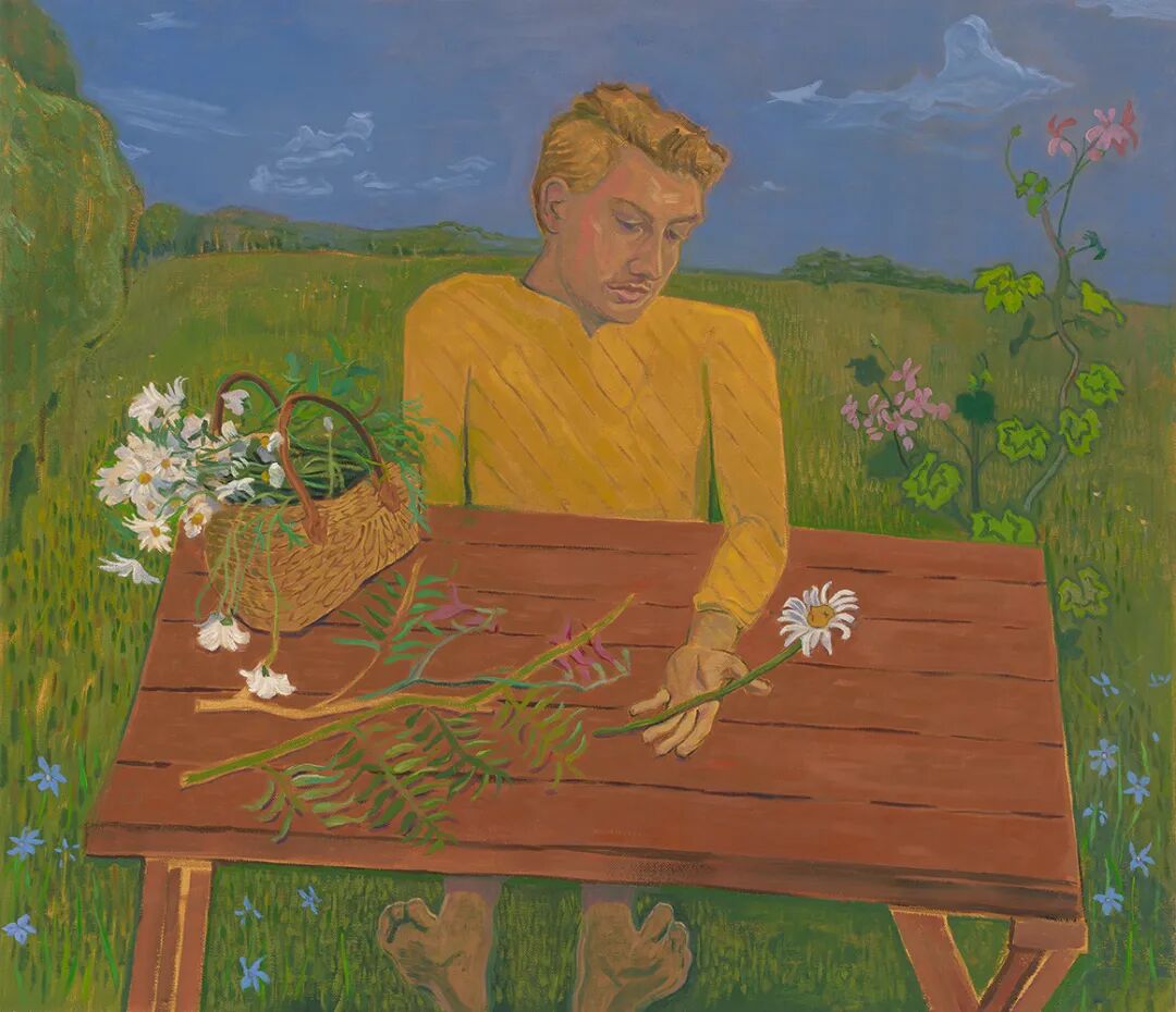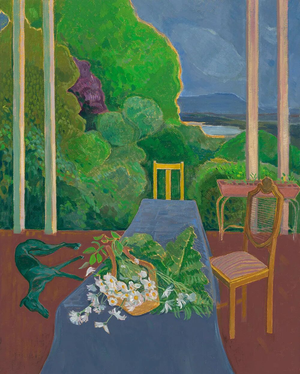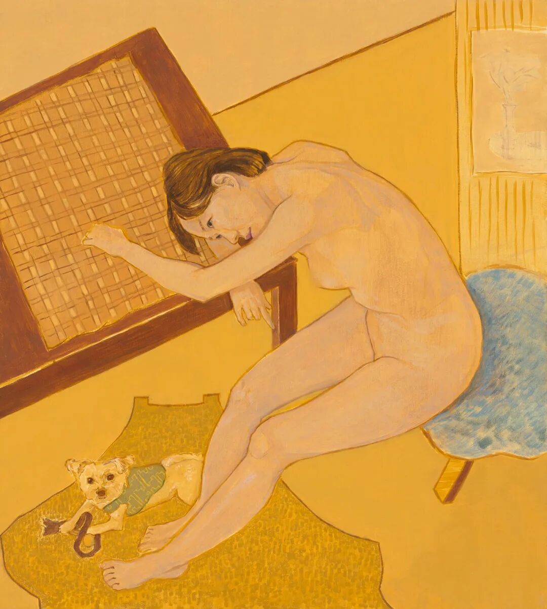 在他的作品里,人、动物与植物的姿态都是轻盈而舒缓的。黑狗正细嗅一束花的芳香;第一片闻到秋天的叶子,在窗边垂头;少女在大风中按紧了帽子,光着身子坐在溪边的枯木上洗脚;夜里女人坐在沙发上看书,男人在一旁拉着小提琴……身体仿佛先于我们的大脑,接纳了浪漫的可能性。