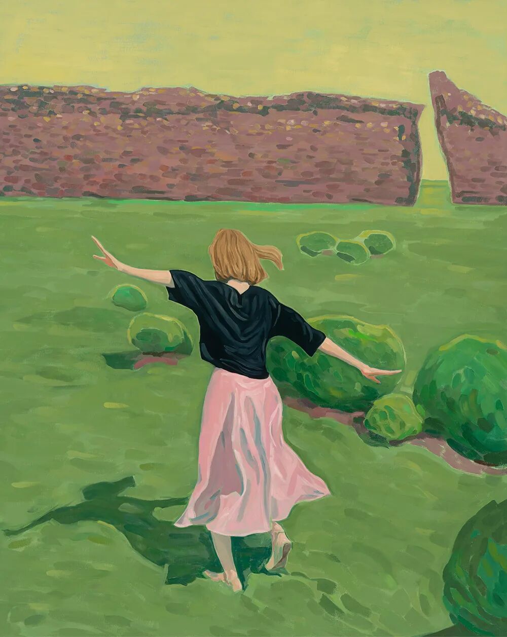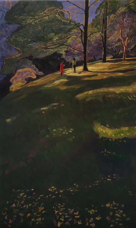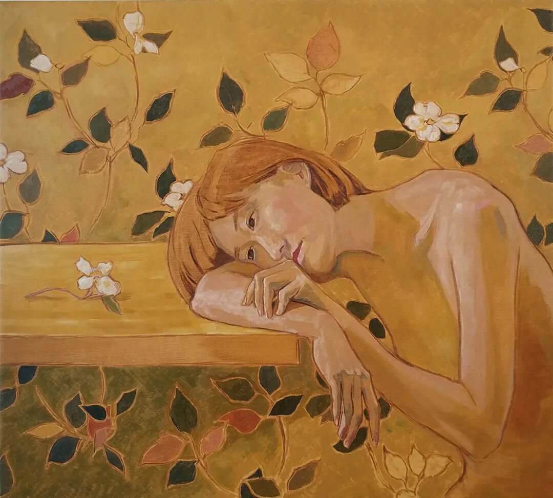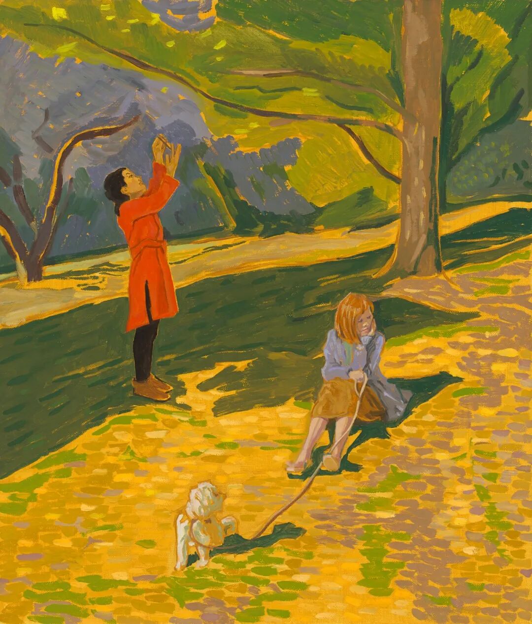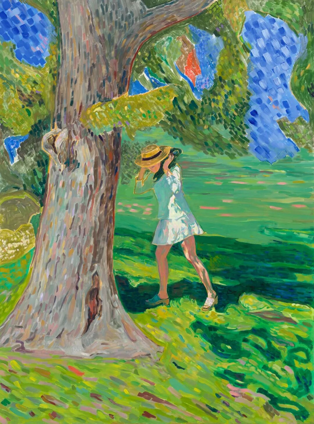 在他的作品里,人、动物与植物的姿态都是轻盈而舒缓的。黑狗正细嗅一束花的芳香;第一片闻到秋天的叶子,在窗边垂头;少女在大风中按紧了帽子,光着身子坐在溪边的枯木上洗脚;夜里女人坐在沙发上看书,男人在一旁拉着小提琴……身体仿佛先于我们的大脑,接纳了浪漫的可能性。