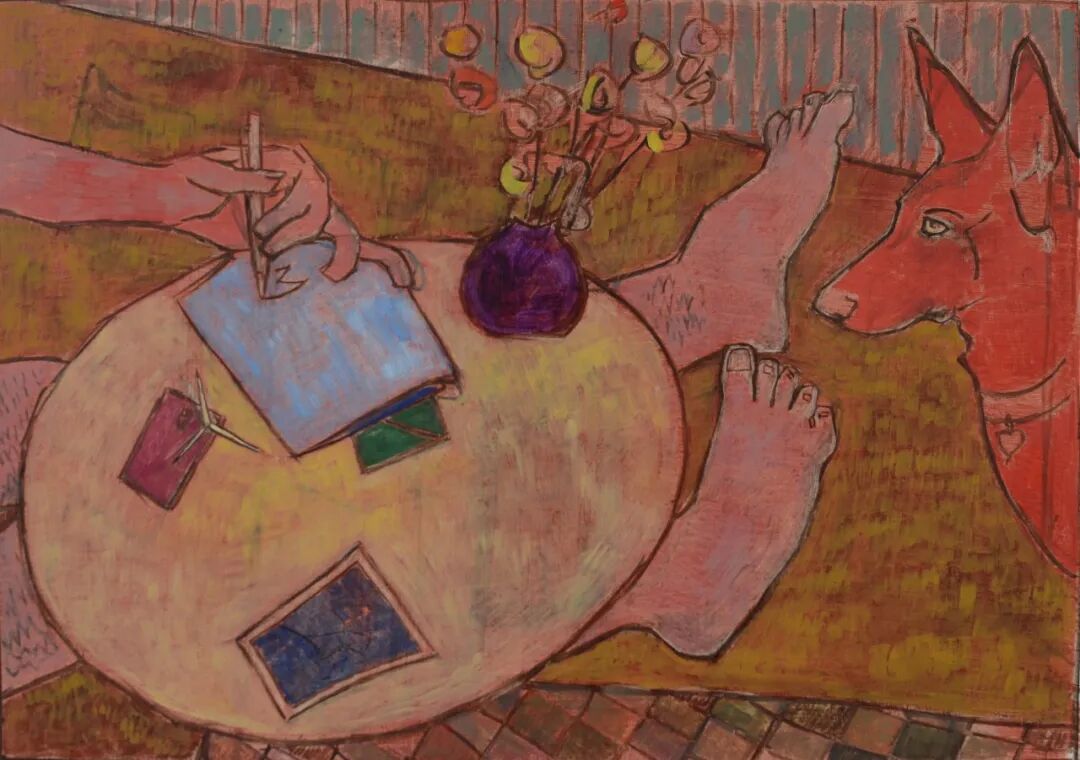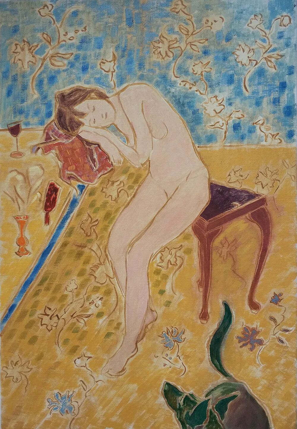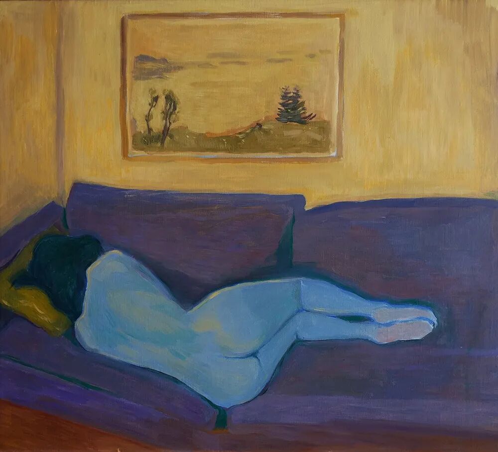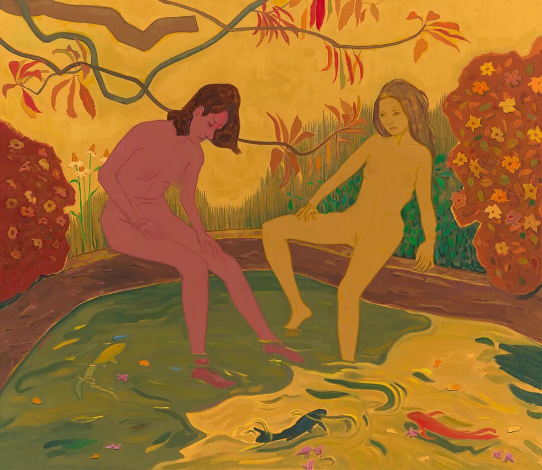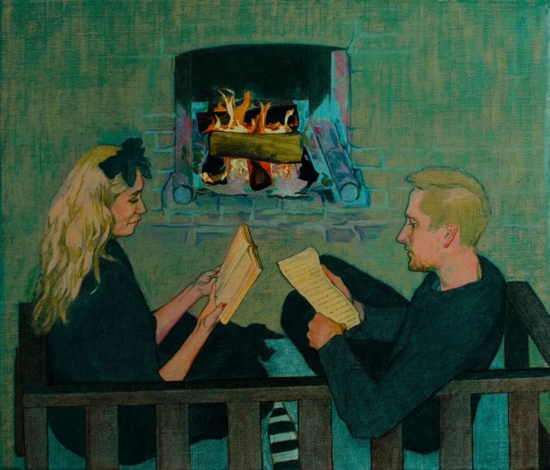 在他的作品里,人、动物与植物的姿态都是轻盈而舒缓的。黑狗正细嗅一束花的芳香;第一片闻到秋天的叶子,在窗边垂头;少女在大风中按紧了帽子,光着身子坐在溪边的枯木上洗脚;夜里女人坐在沙发上看书,男人在一旁拉着小提琴……身体仿佛先于我们的大脑,接纳了浪漫的可能性。