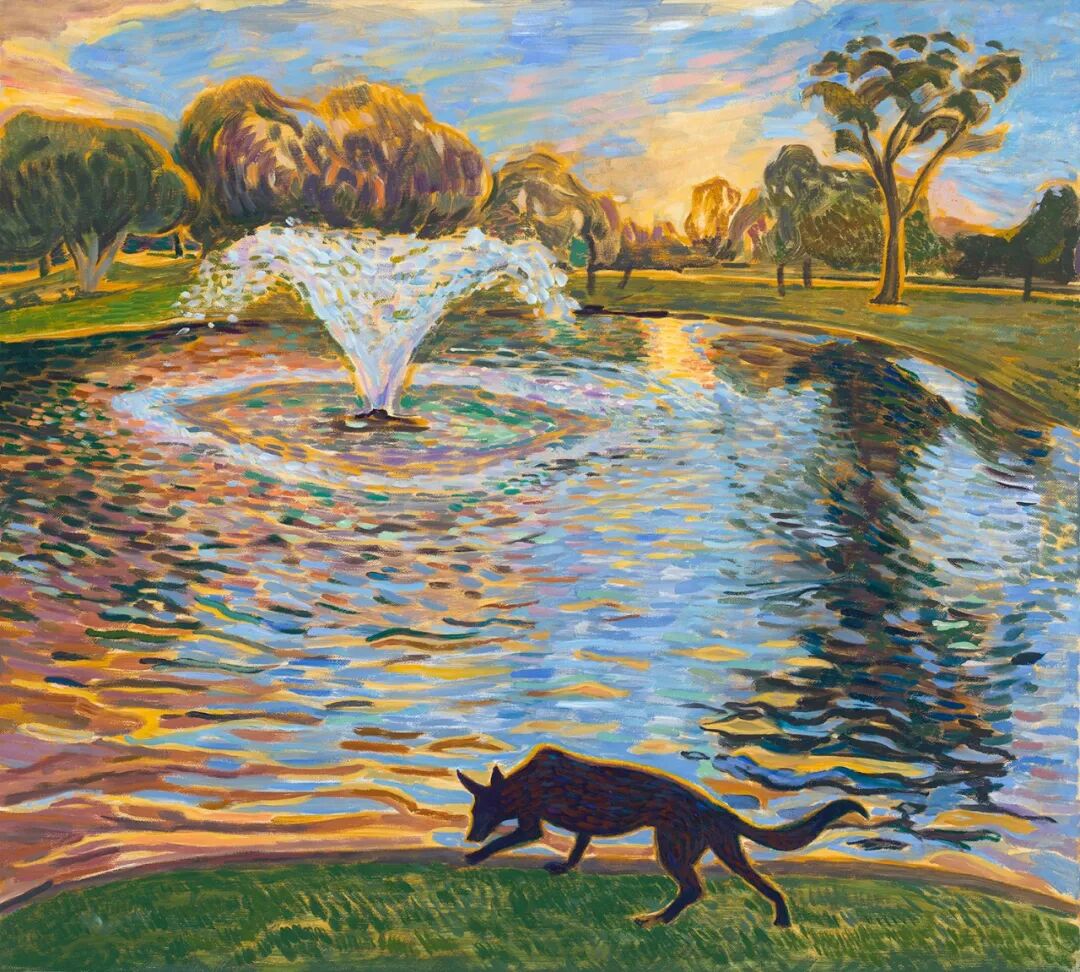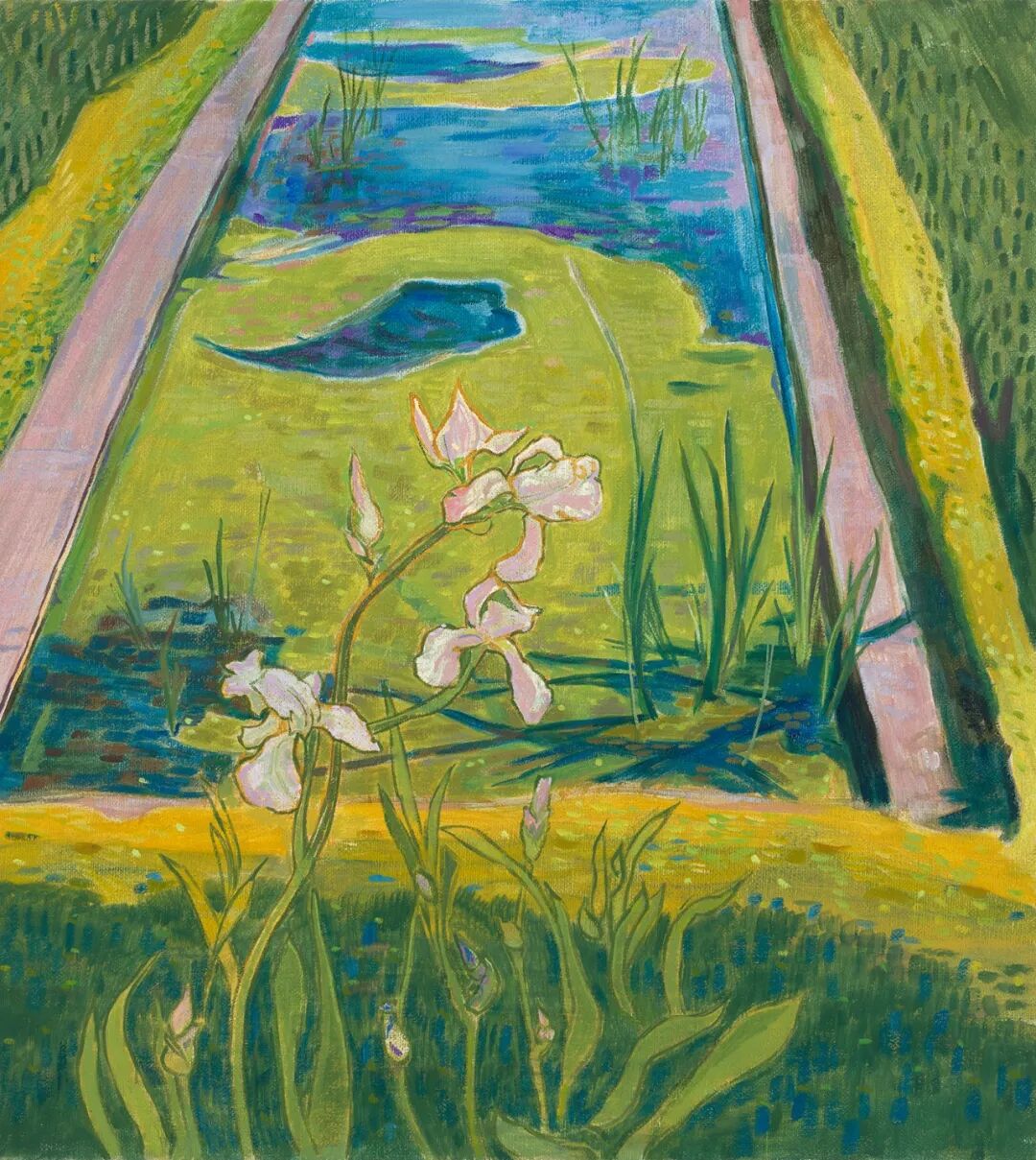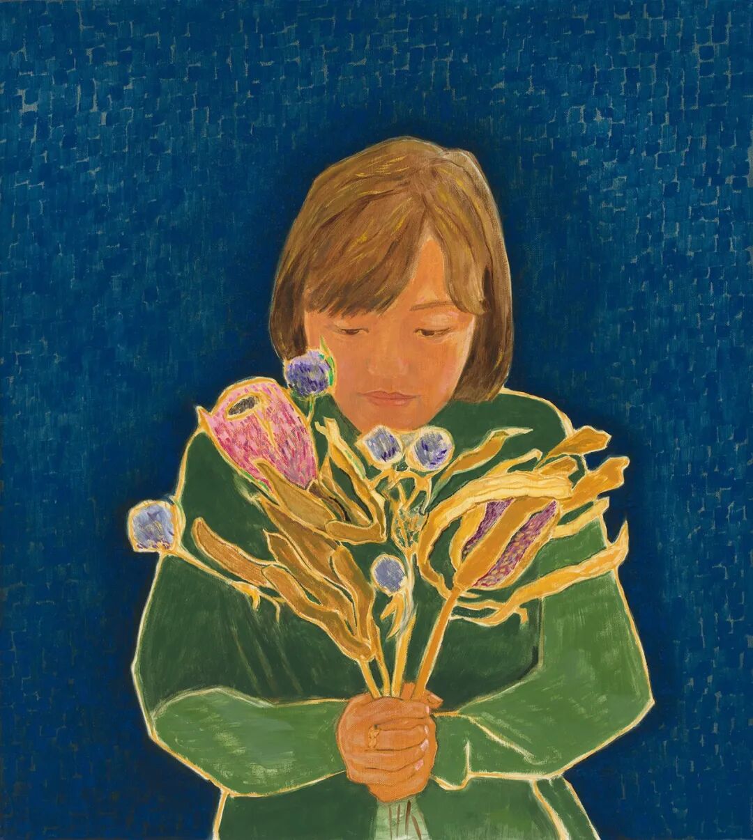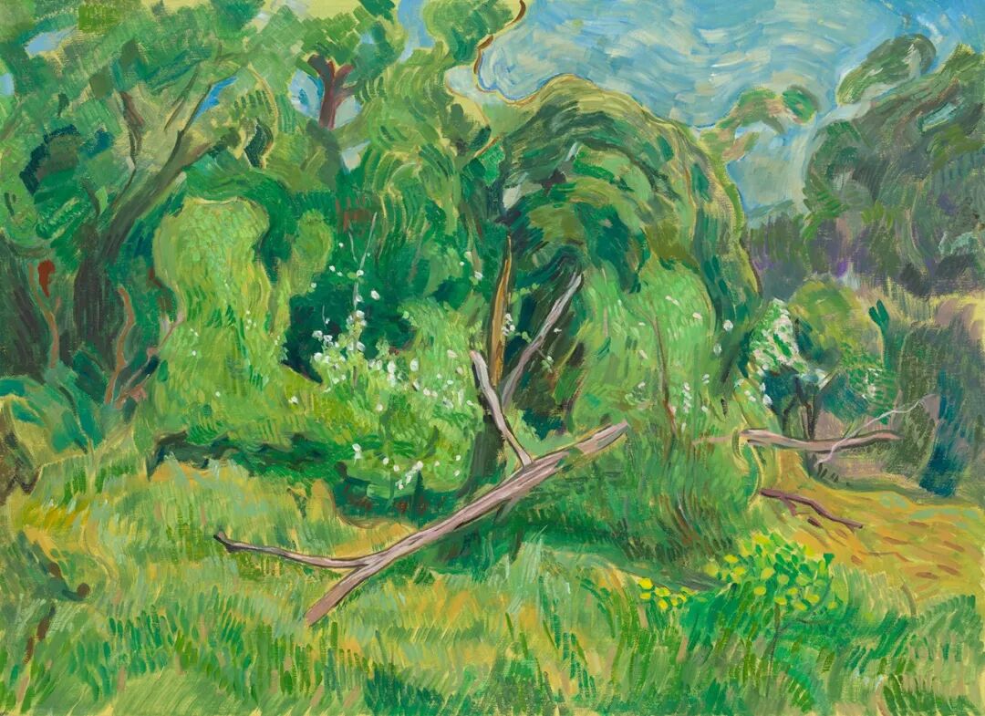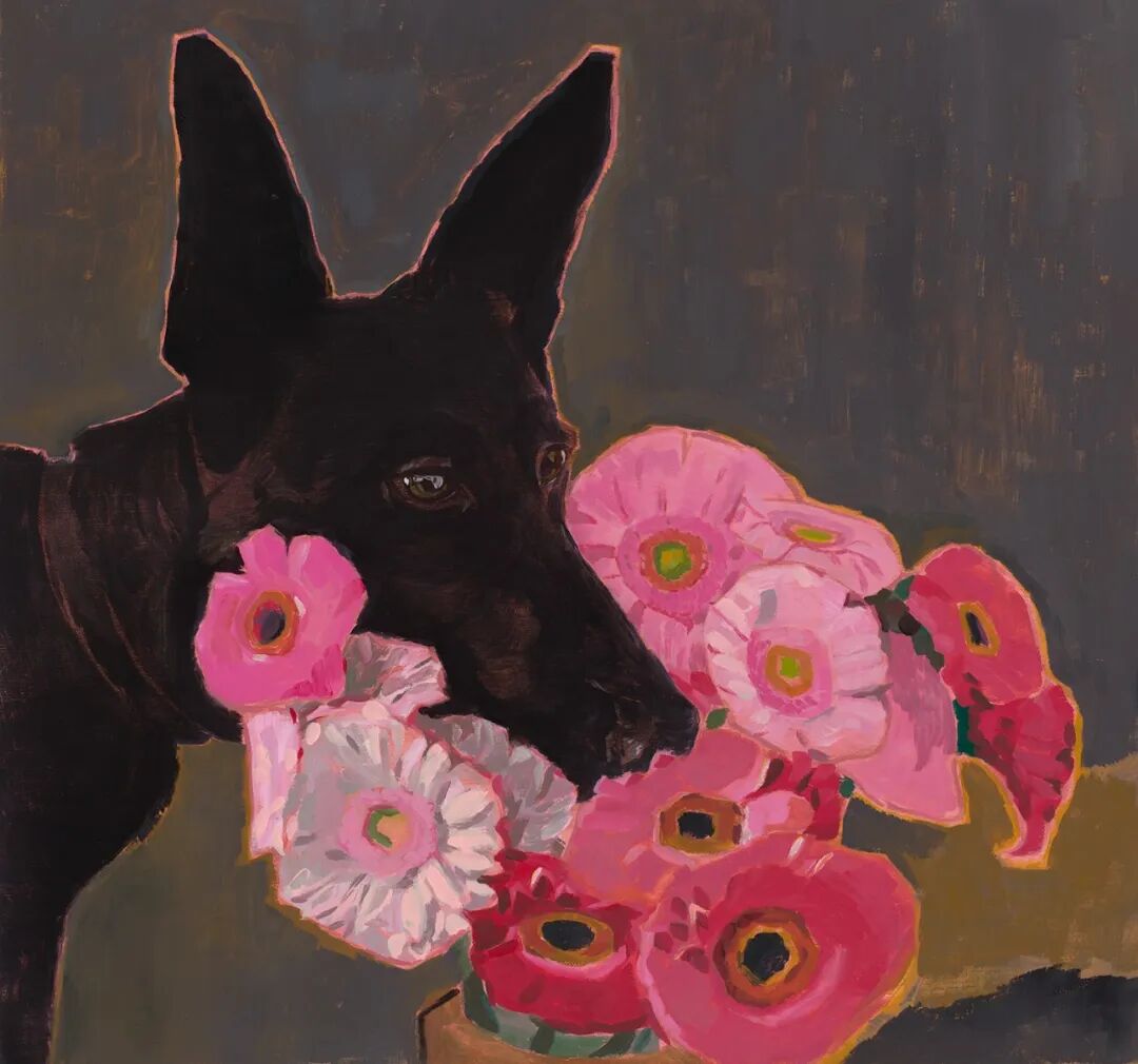在他的作品里,人、动物与植物的姿态都是轻盈而舒缓的。黑狗正细嗅一束花的芳香;第一片闻到秋天的叶子,在窗边垂头;少女在大风中按紧了帽子,光着身子坐在溪边的枯木上洗脚;夜里女人坐在沙发上看书,男人在一旁拉着小提琴……身体仿佛先于我们的大脑,接纳了浪漫的可能性。