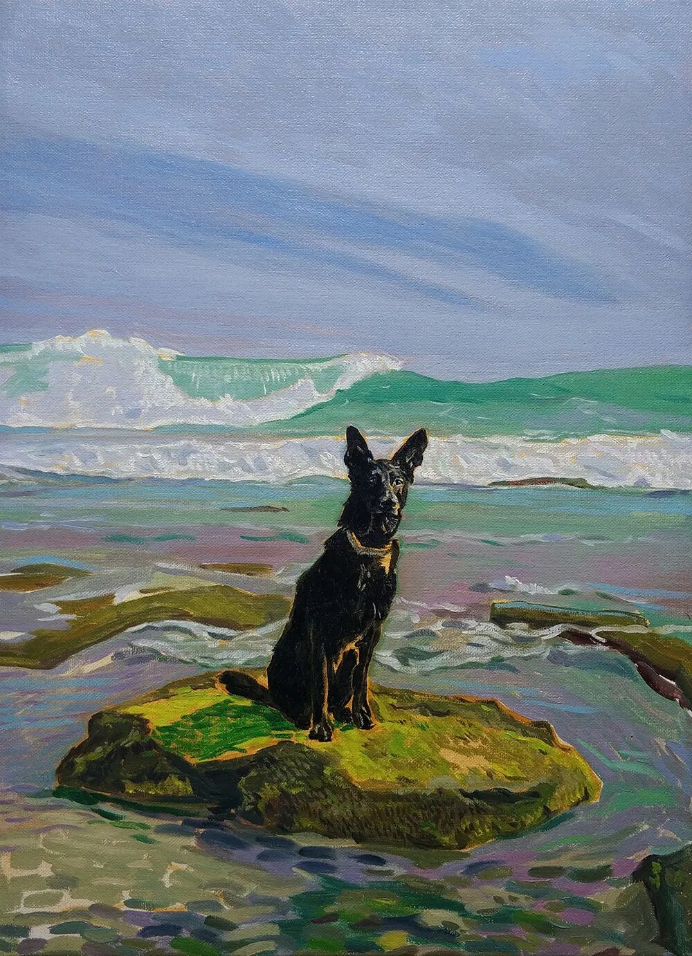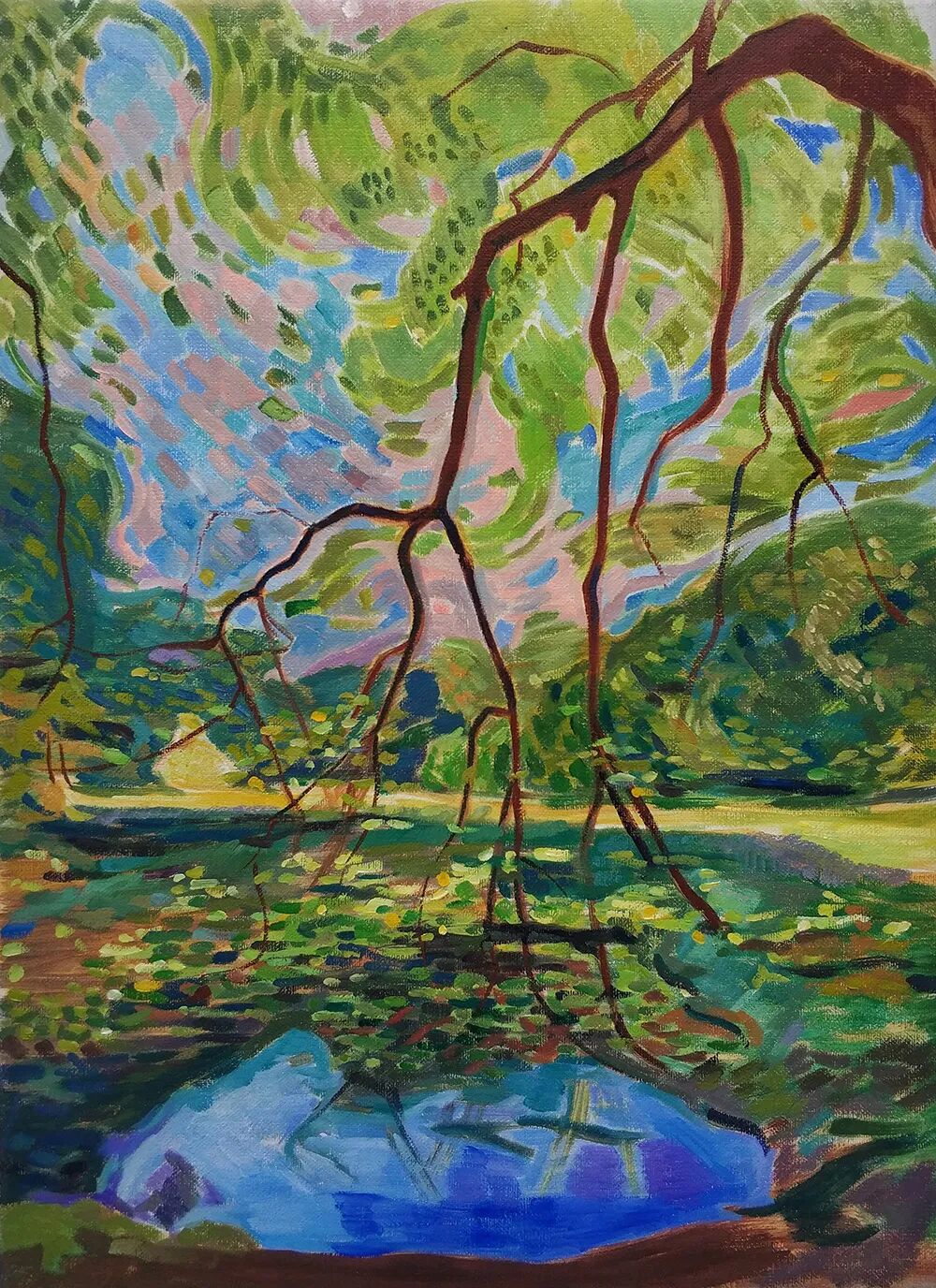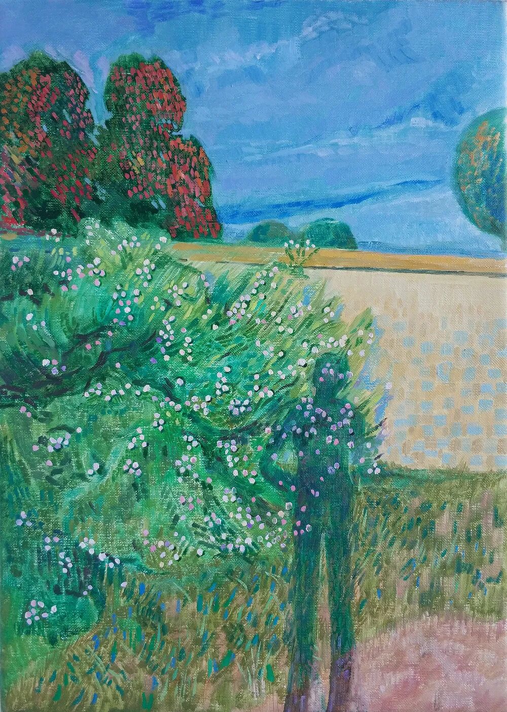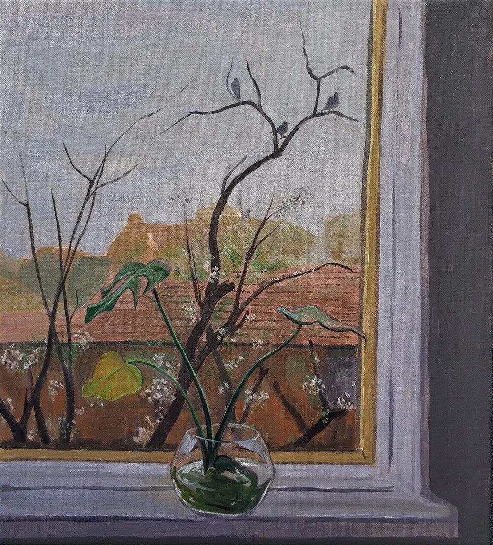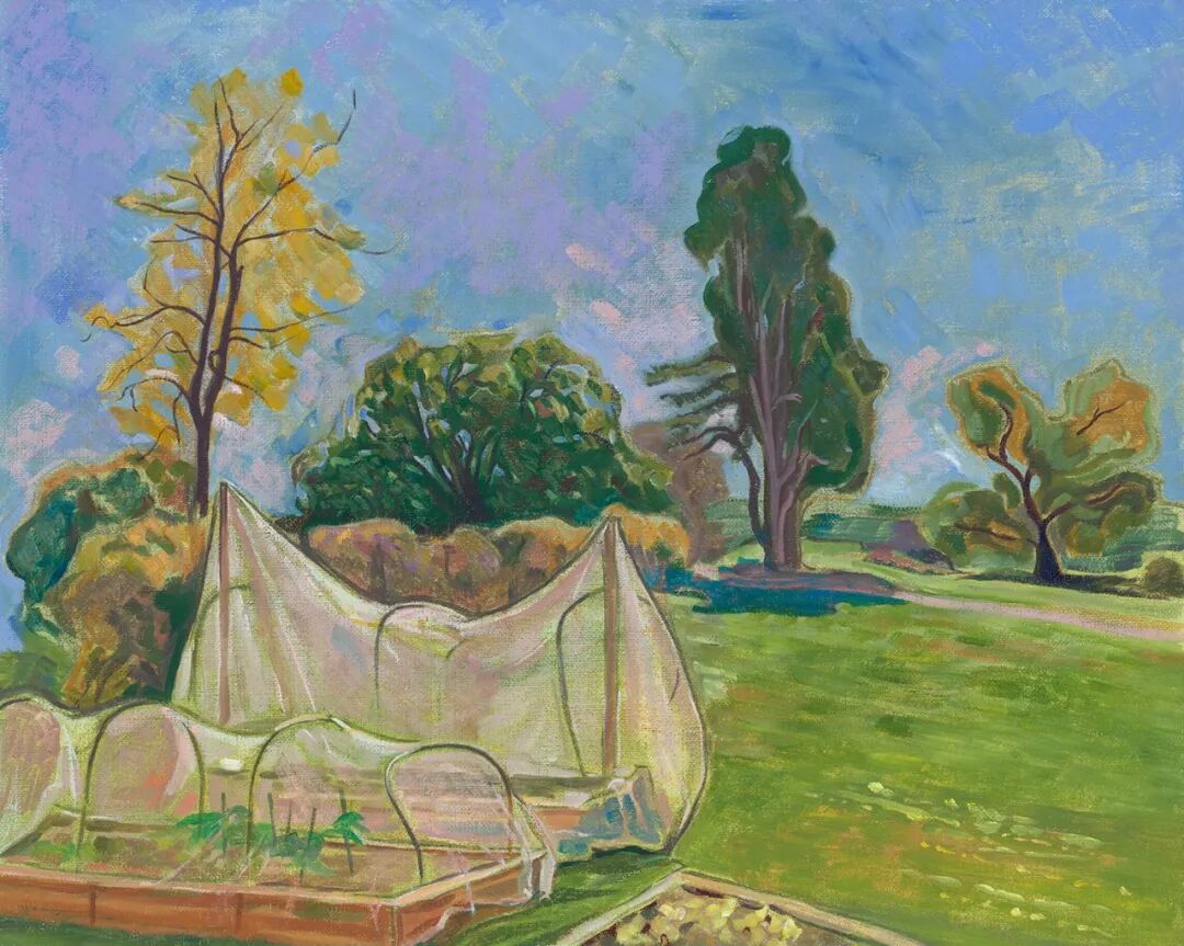 在他的作品里,人、动物与植物的姿态都是轻盈而舒缓的。黑狗正细嗅一束花的芳香;第一片闻到秋天的叶子,在窗边垂头;少女在大风中按紧了帽子,光着身子坐在溪边的枯木上洗脚;夜里女人坐在沙发上看书,男人在一旁拉着小提琴……身体仿佛先于我们的大脑,接纳了浪漫的可能性。