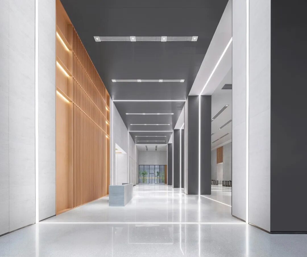 黑与白、纵与横、冷与暖的强对比手法突破秩序维度,形成的反差给人提供直观感受和联想根据,生出夸张的视觉效果和强烈的感染力,增加空间的层次与趣味性。线性的光切进空间,是为亮点,用光束的线性感描述空间结构,以空间表达光的形状,将光与新古典建筑相融合。