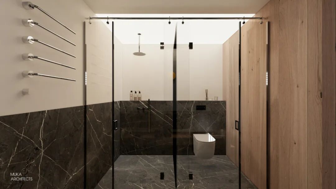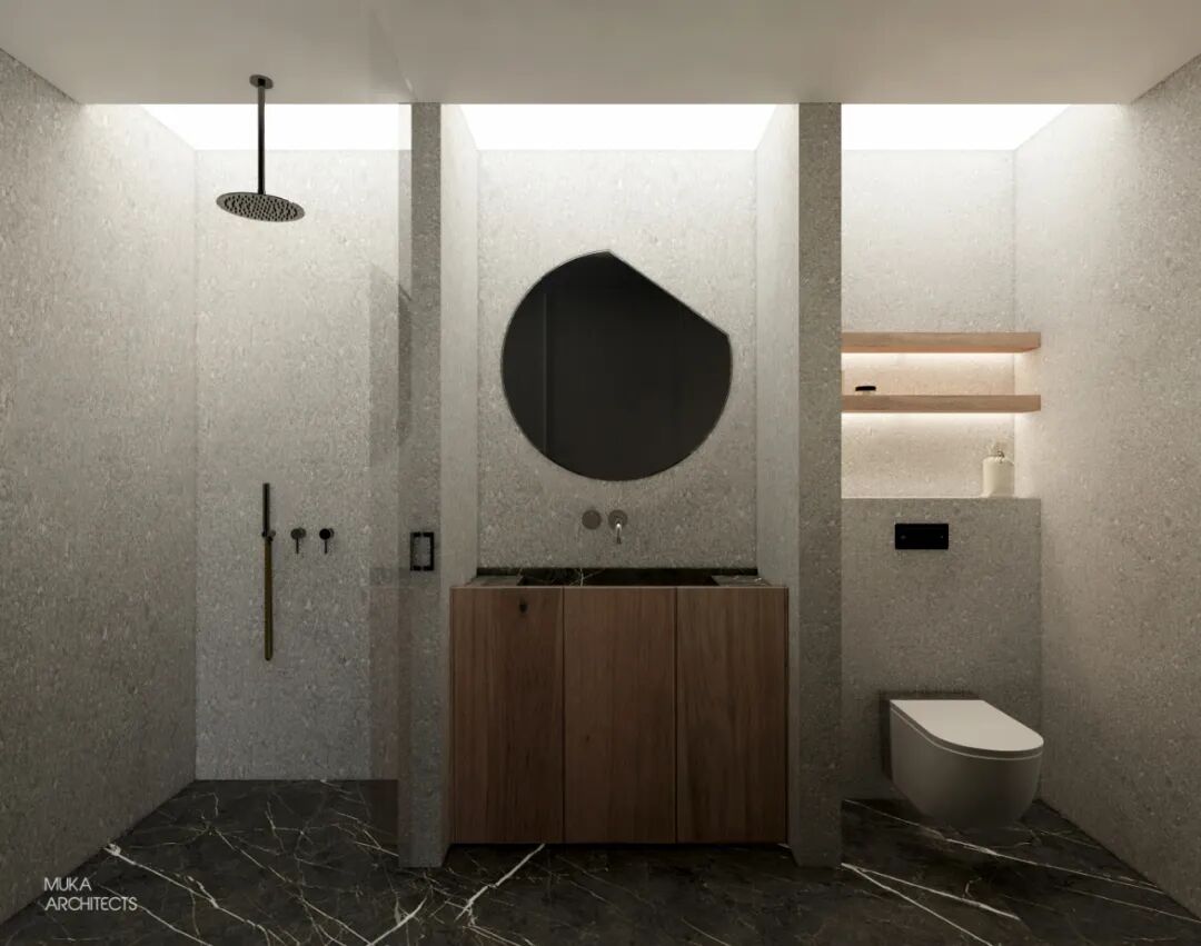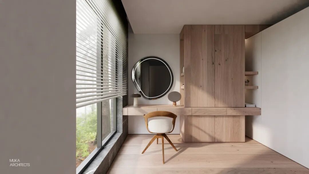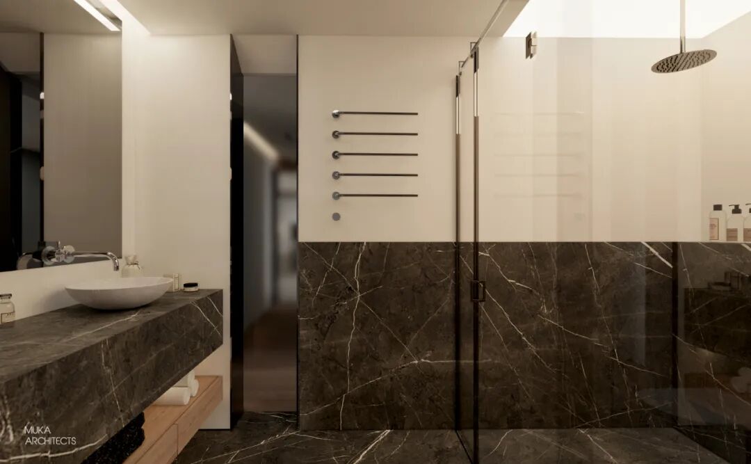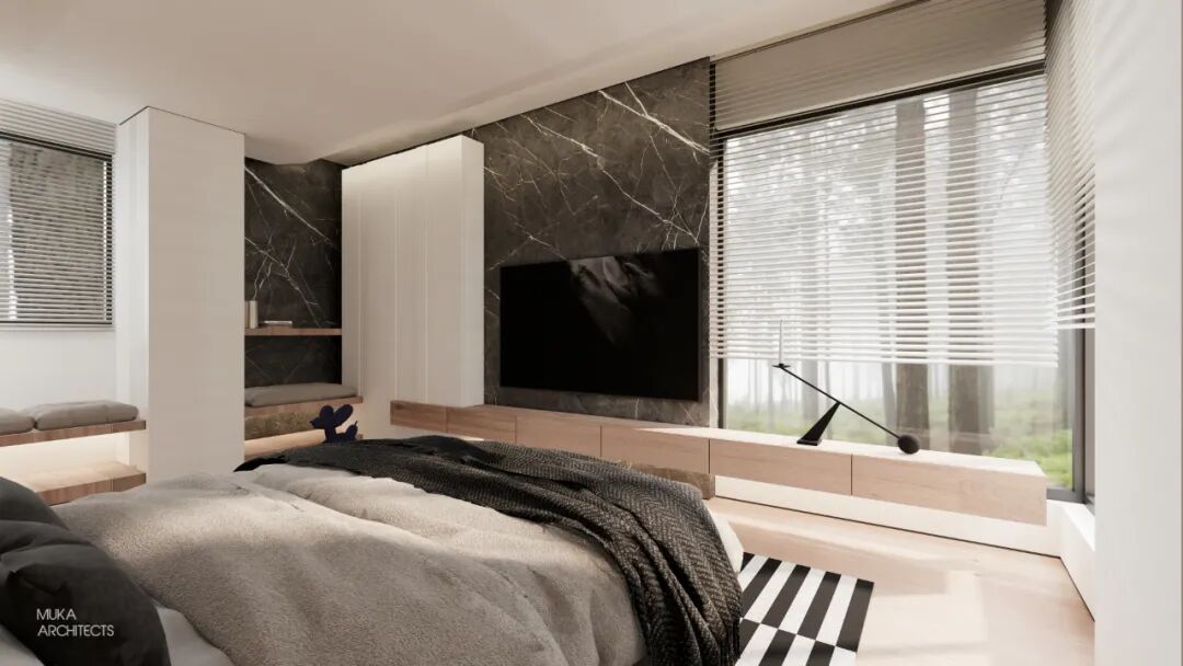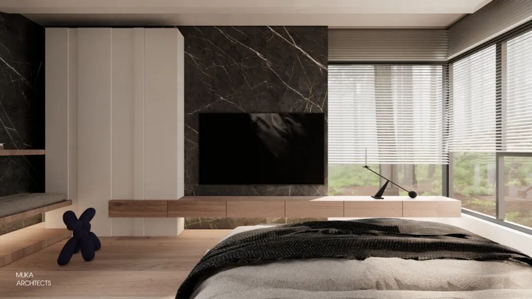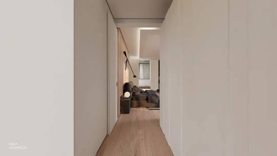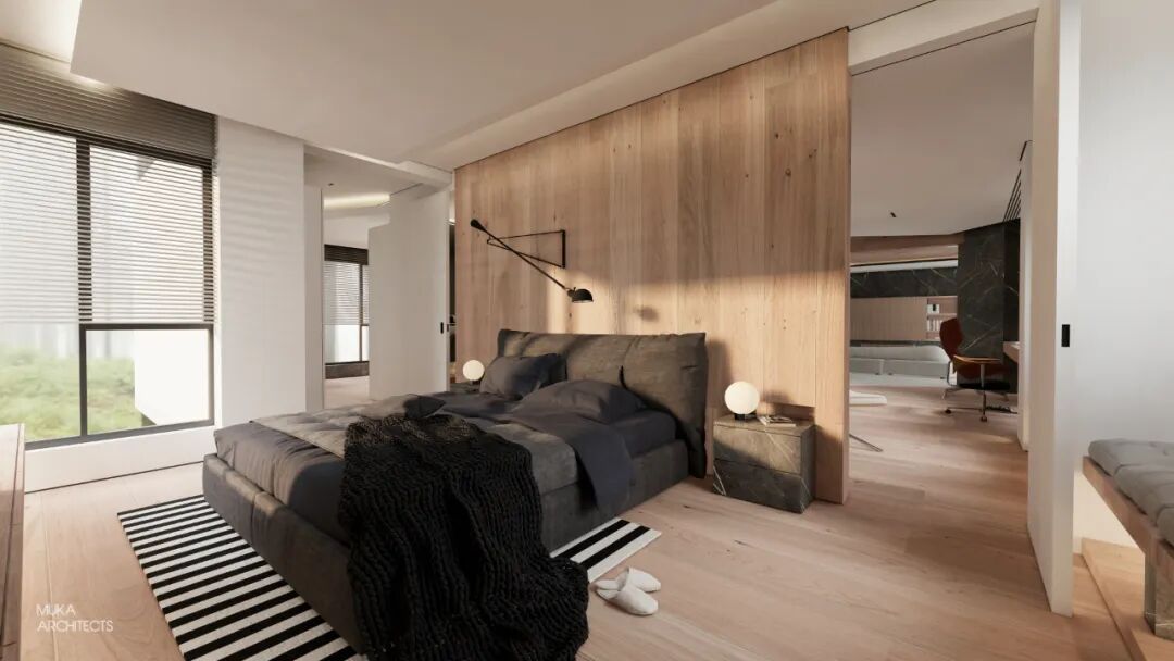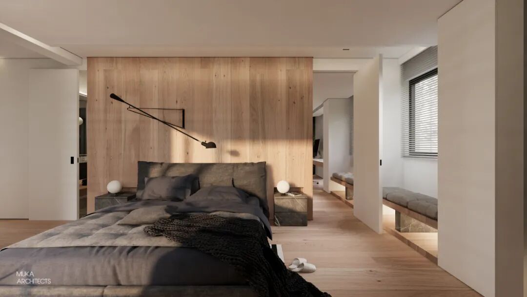 金属百叶制造的外景模糊入室与光影的韵律把控也是都市主义的重要氛围组成。主卧半洄游动线和套间功能,甚至床头可满足不同角度用光的悬臂灯,都确保了使用的便利及视觉美的协调双重标准。