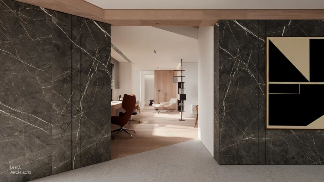 公区做到LKD大纵深空间,半公区营造双动线,符合主人与长辈及佣人的私密划分。原本户型有不规则的结构部分,利用平面寻找出的“斜线元素”作为功能与视觉线索。