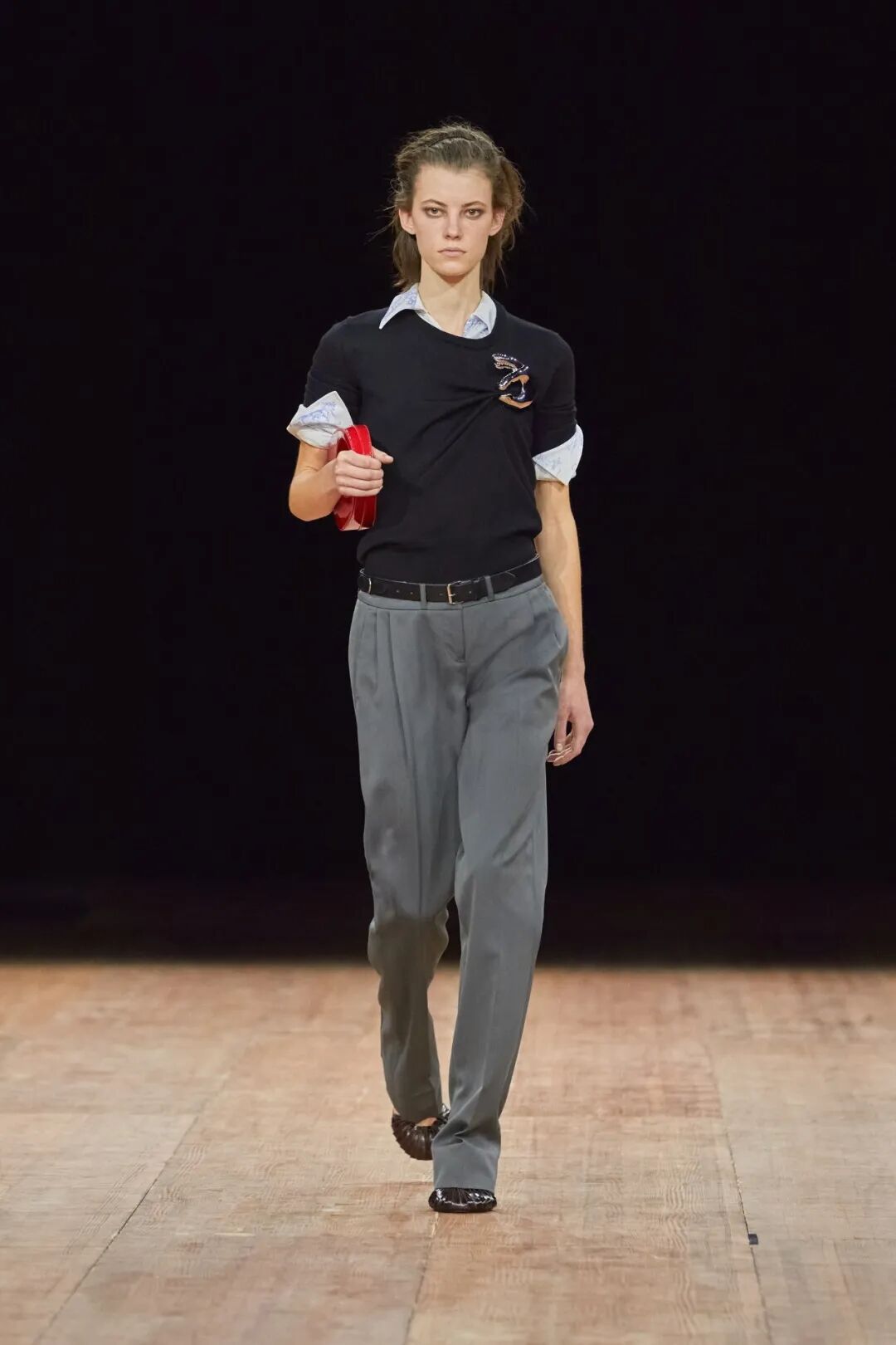 Coperni2023 AW以 Jean de la Fontaine 的《狼与羔羊》为灵感,重新诠释为人类和机器人的关系。比如设计师用AI画了一幅羔羊图像用在了皮夹克外套上,并通过模拟emoji的胸针、手袋、靴子来具象化他们的主题。压轴模特手拎标志性 Swipe 包,不同于上一季的黄金Swipe 包,这个月球陨石swipe手袋由 55,000 年前撞击法国南部的陨石制成,还有再生尼龙材质外套、羽毛形状拼接而成的全反光连衣裙,延续品牌一贯科技主义色彩。