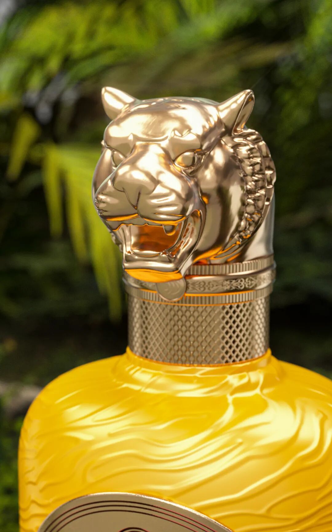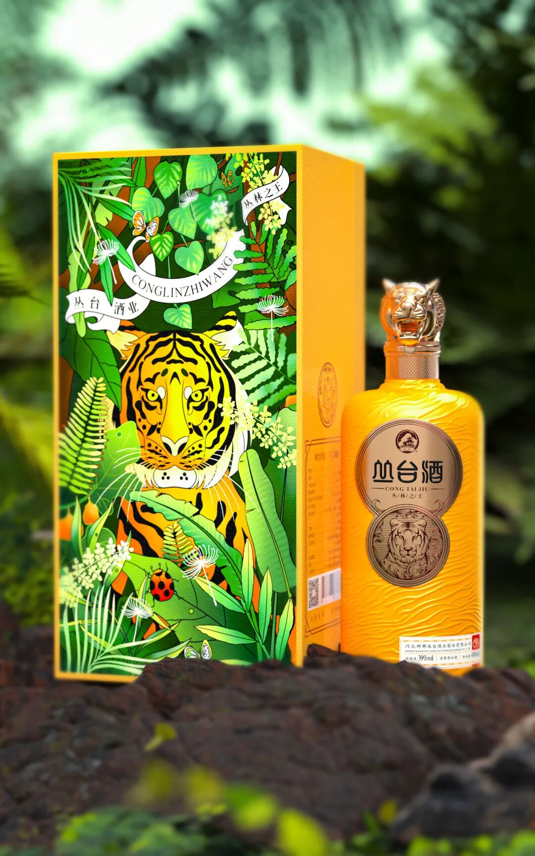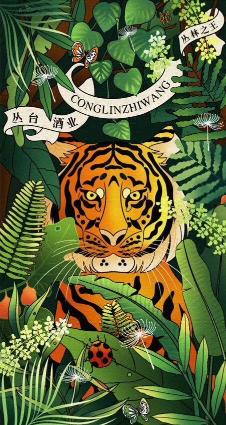 整体造瓶型灵感来源于生肖虎形象,体现了产品特色与卖点,中国人自古就喜欢虎,虎是强壮、威武也是财富和权力的象征,也是代表吉祥与平安的瑞兽。插画形式采用丛林和老虎相结合,生肖虎是权利和自信的象征,丛林之王正好体现生肖虎的所有特性。