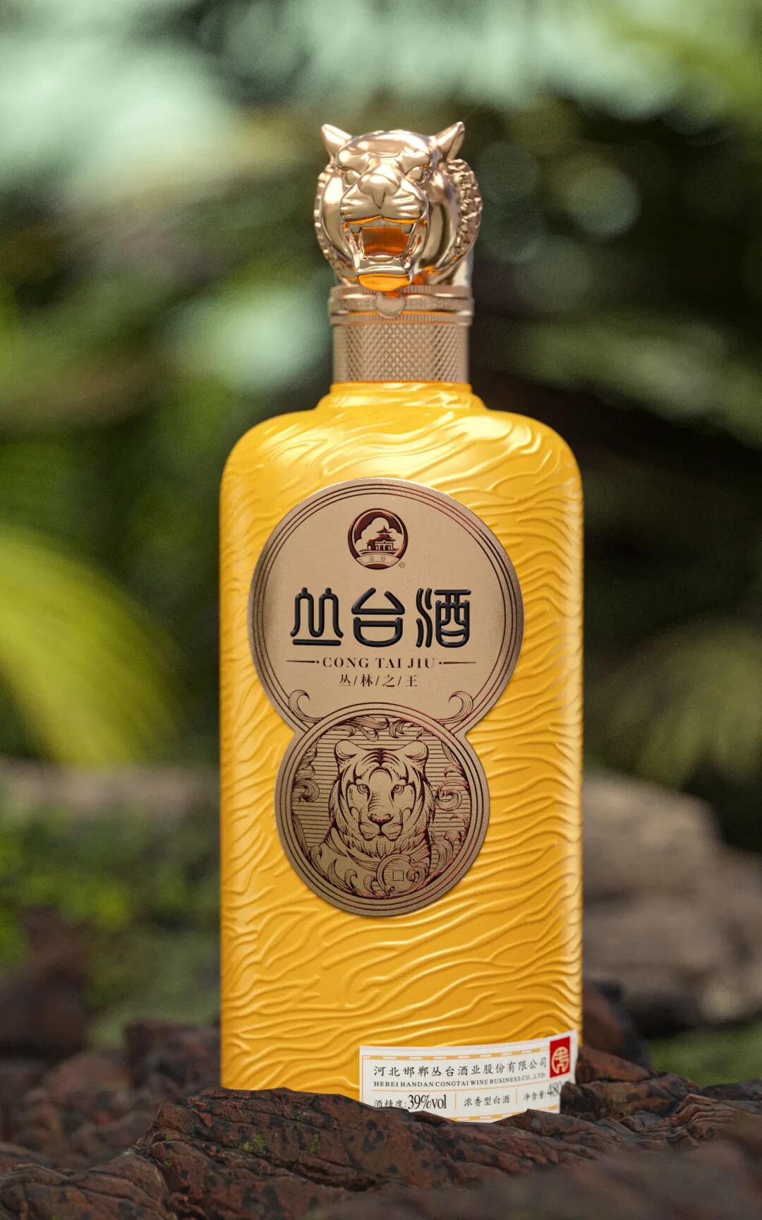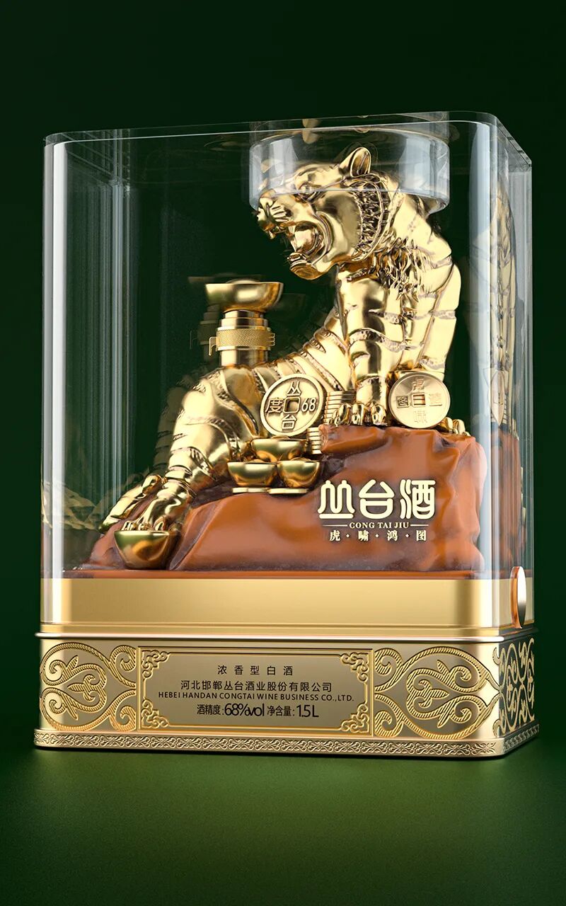 以虎纹与水相结合的形式表现,虎纹霸气饱满,彰显王者气度,契合虎年生肖酒的灵魂,同时也表现了酿酒之源。