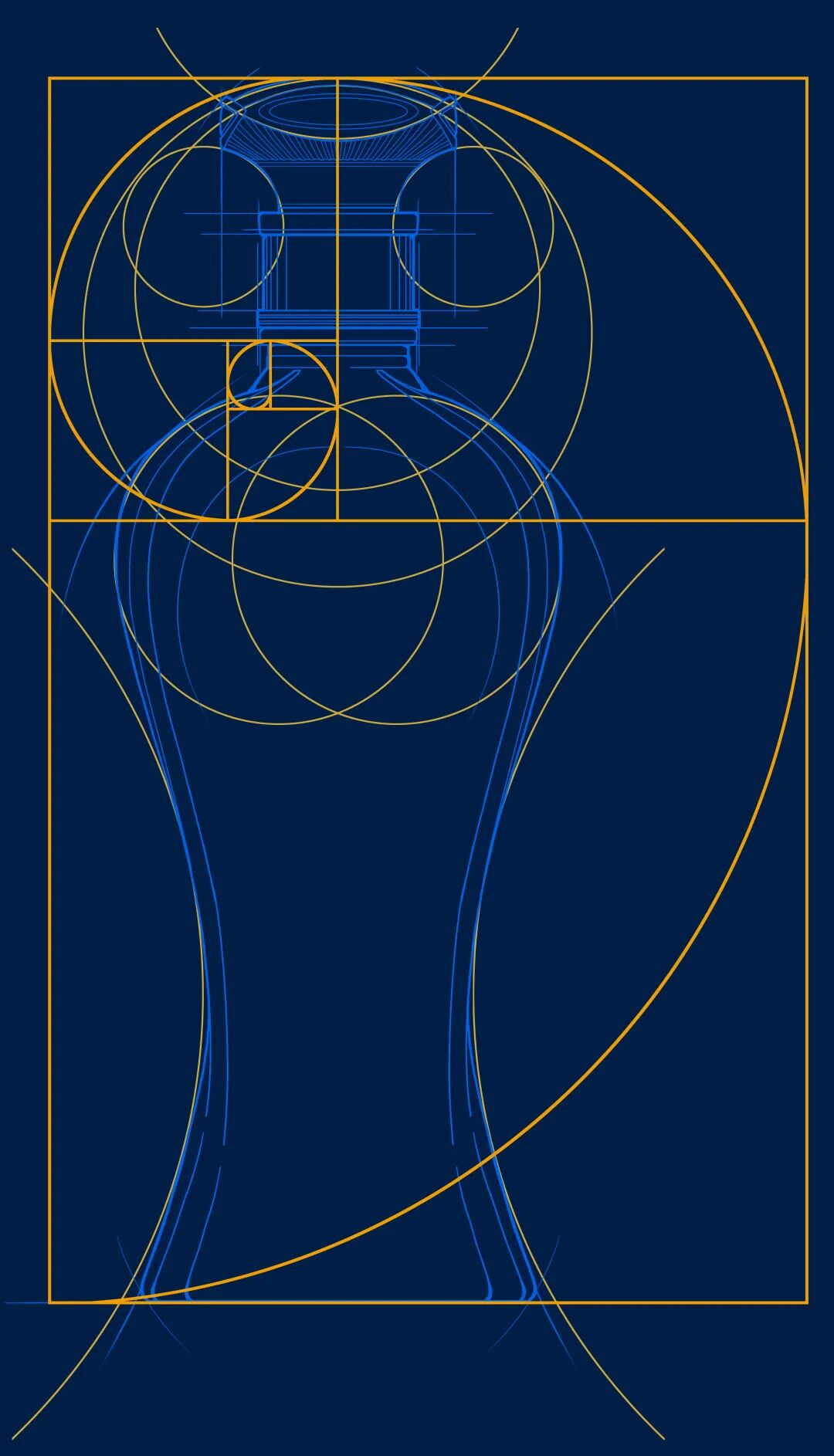 遵循理性美学的原则,通过增大瓶盖的造型体量,打破瓶盖、瓶肩、瓶底三者联动的平衡轮廓,运用“斐波那契螺旋线”585的黄金法则调整整体的比例。营造更为优雅动感的“点线面”超级黄金比例的节奏,使整体造型更有力量感。