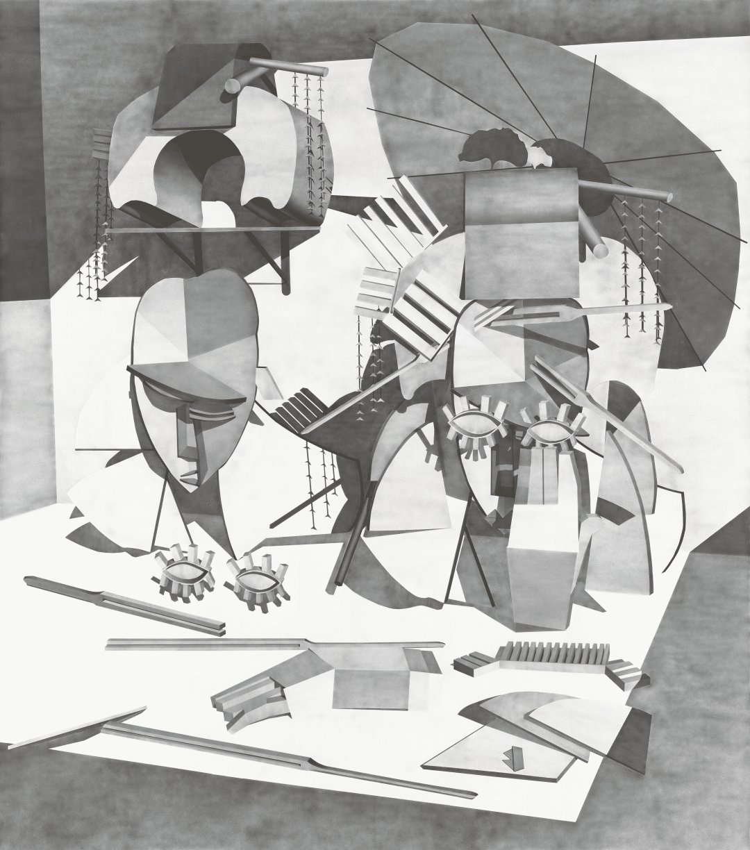作为一位拥有雕塑家视角的画家,《伟大缪斯》揭示了辛雅对雕塑最初的兴趣。作品描绘了一间典型工作室的布置陈列,布满钳子、纸张及储物架。她取材于建构主义、未来主义和漩涡主义的形式美学,将三维雕塑作品转化为二维平面。