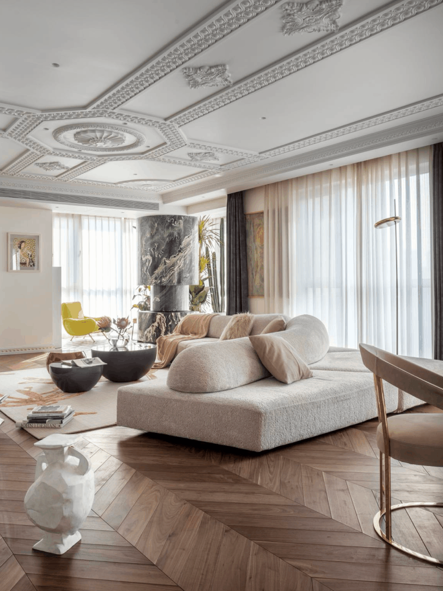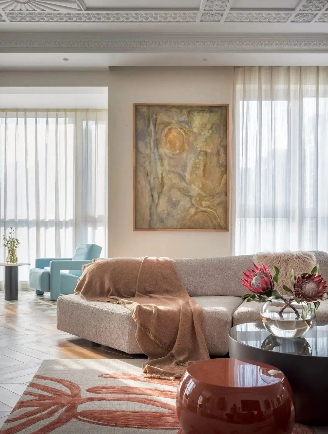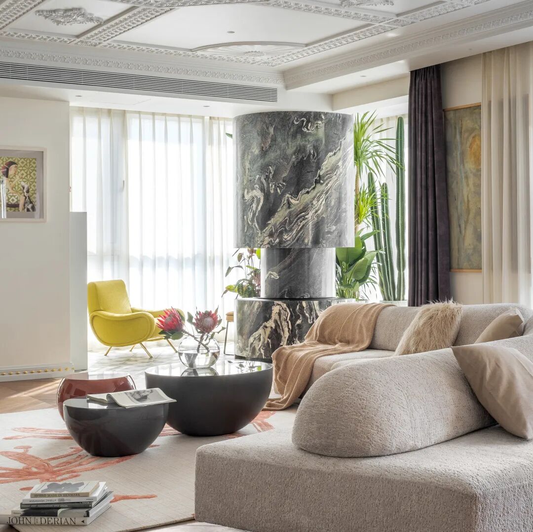 成长的过程中,对彼此、对生活的认知也在改变。从远离市区的别墅,到城市中心的公寓,一家人提出更高的使用要求:Kelly自身对生活美学的追求、与先生相伴的二人时光、儿子与儿媳假期回来小住、老人的生活便利性等。爱静想要为其呈现一个颠覆以往所有住宅设计、从视觉到身心的全新的体验,将自由、舒适、优雅的美学态度释放出来。