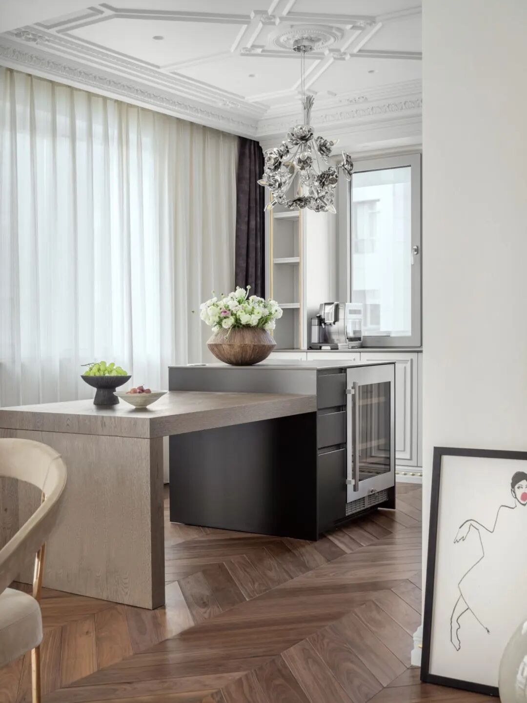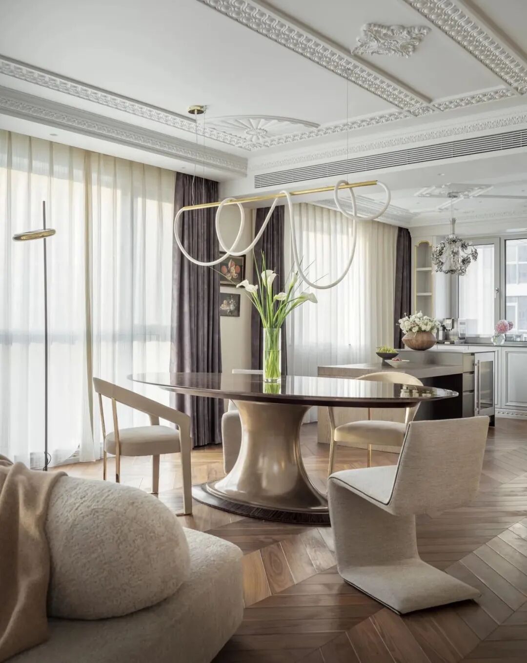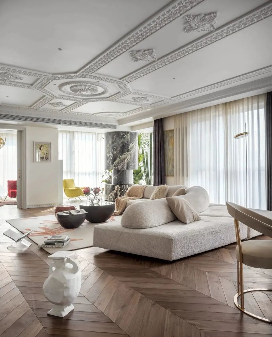 成长的过程中,对彼此、对生活的认知也在改变。从远离市区的别墅,到城市中心的公寓,一家人提出更高的使用要求:Kelly自身对生活美学的追求、与先生相伴的二人时光、儿子与儿媳假期回来小住、老人的生活便利性等。爱静想要为其呈现一个颠覆以往所有住宅设计、从视觉到身心的全新的体验,将自由、舒适、优雅的美学态度释放出来。