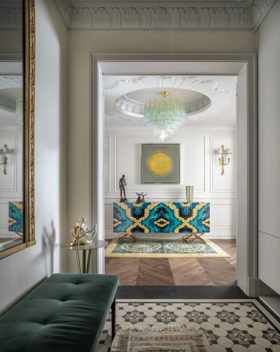玄关处的画作名为《春之荣耀》,出自现当代艺术家保罗·艾斯卡特。春天是万物复苏的季节,作者用柔嫩的色彩表现春的欣然,金色圆形是作者常用表现手法,在他看来,圆是宇宙的形状,是周而复始,也是海纳百川,是日也是月,是新年伊始的美好期冀。
