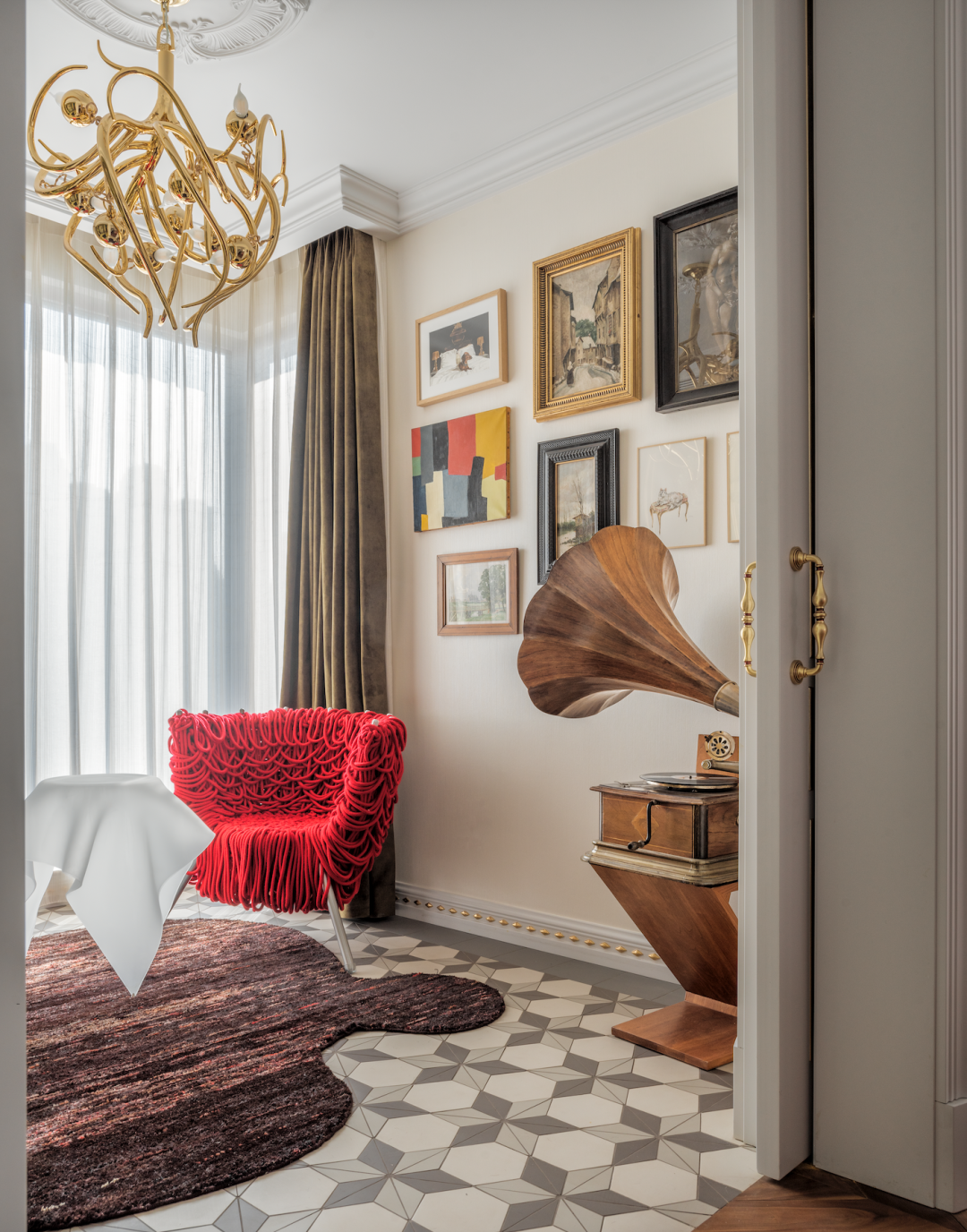 在最爱的书房,高饱和色彩带来独属于生活的浪漫主义,时光将不同年代的物品串联,复古家具承载着旧时光,复古留声机娓娓响起,当代先锋艺术融入其中,从欧洲收藏的小画挂满整墙……老灵魂和新思想的碰撞间,讲述着曾经,也承载着新的空间记忆。