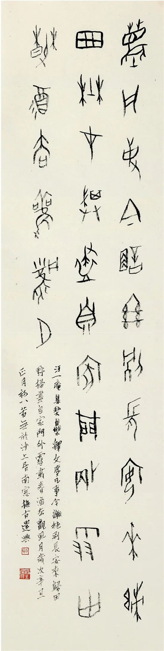 毫不例外,甲骨文书法同正草隶篆一样面临一个临摹——创作——再临摹的过程,我在临摹甲骨文时,先通读,再挑出刀味结构佳的进行放大,裝订成册,时常揣摩,刚开始时,写出的甲骨文总有很多篆书的影子,中规中矩,不大活泼,而甲骨文最大特点之一就是天真烂漫,劲挺自由,所以在临累了疲劳时就多看多品味——只有掌握了甲骨文的规律,才能登堂入室,渐入佳境。而在甲骨文创作中最难的也是经常碰到的的问题是范字的不足。甲骨文书法创作同其他字体相比较难,社会上研究它的人本来就少之又少,这里我们不妨多听听董作宾先生的意见:书写甲骨文书法“不能用学术立场加以限制”,有的字可以“借用初文”,有的可釆用“假借”,当然我们也不能用这样的借口做挡箭牌,碰到没有的字就可以胡编乱造,这里面还有一个原则问题,首先尽量用已确认的字,实在没有不得已才可用假借或初文,这里还牵涉作者的学养水平,平时要多读一些文字学方面的书,多査阅典籍资料,否则要想在甲骨文领域有所作为是难之又难的。古人论书有“书贵瘦硬方通神”之谓,这用在其它字体可能会有争议,而用在甲骨文书写却是至论,因为甲骨文是契刻而成,以刀代笔,这就注定了它的鲜明特点,我们看甲骨原作,就不难发现它的线条质量是何等高妙,瘦劲有力,绝非是那种单调无生命力的春蚓秋蛇。