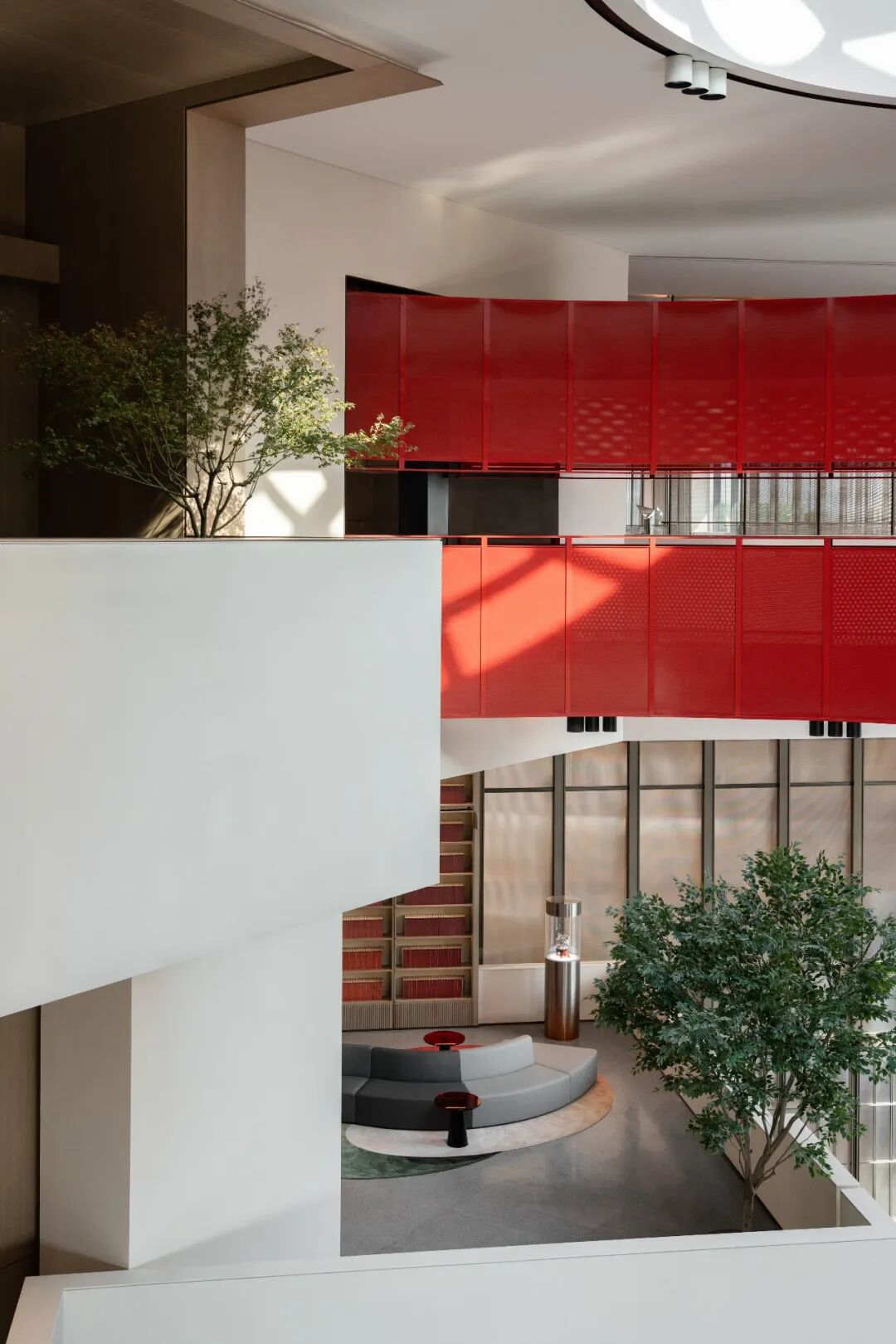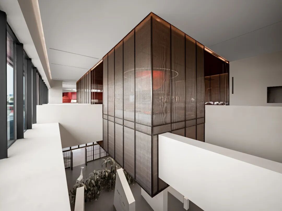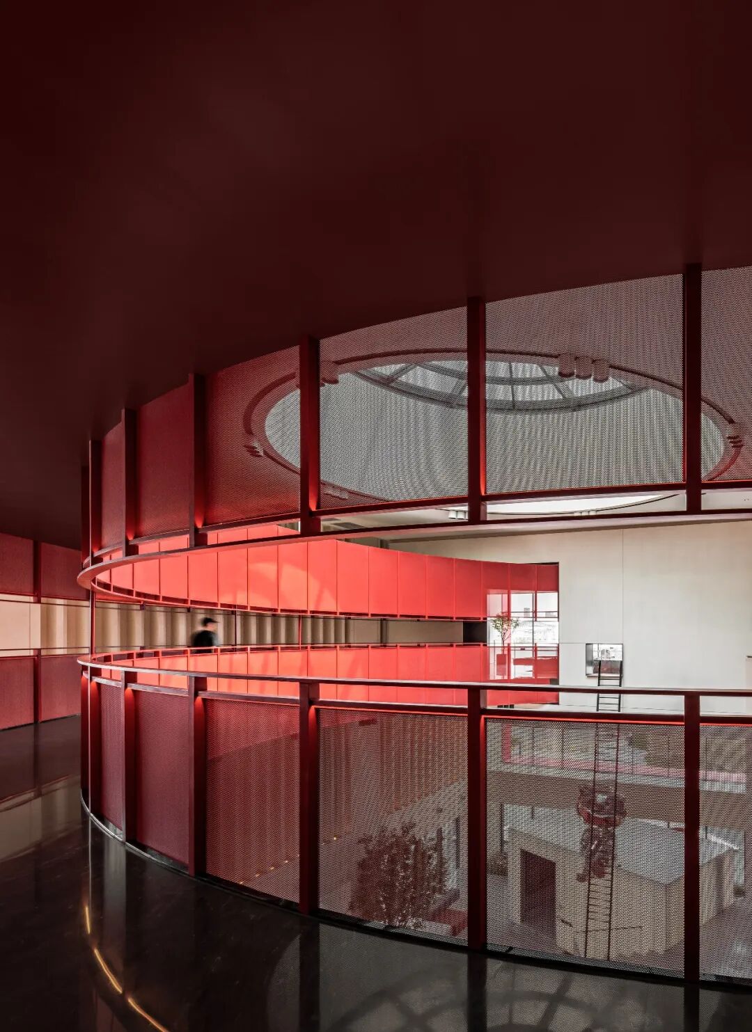 The negotiation area emphasizes the visual texture and strong material aesthetic feeling through the collocation of color, texture and luster. Using the light and shadow transformation of lighting media to create an artistic atmosphere, a large area of red metal mesh material enriched the hierarchical relationship of the whole space.