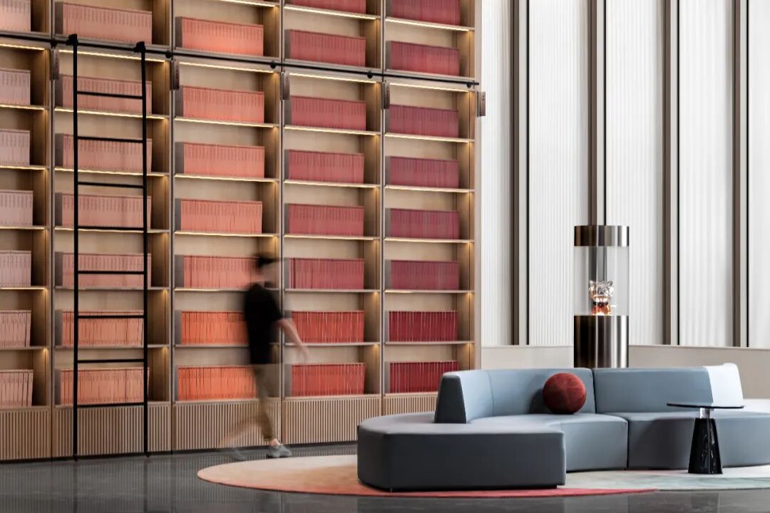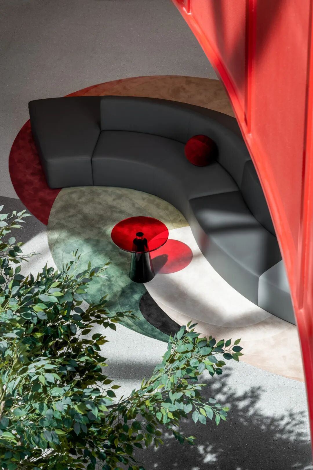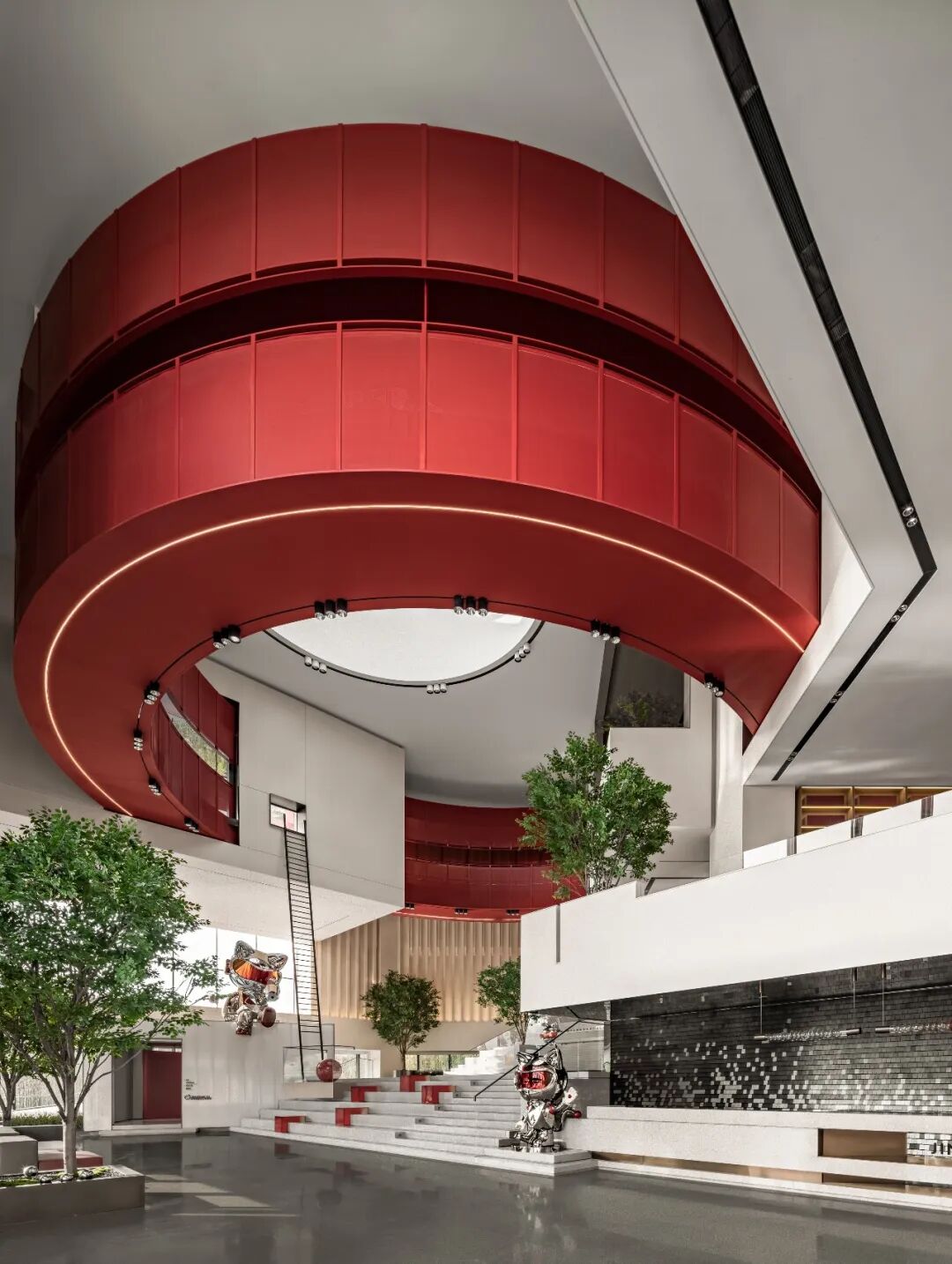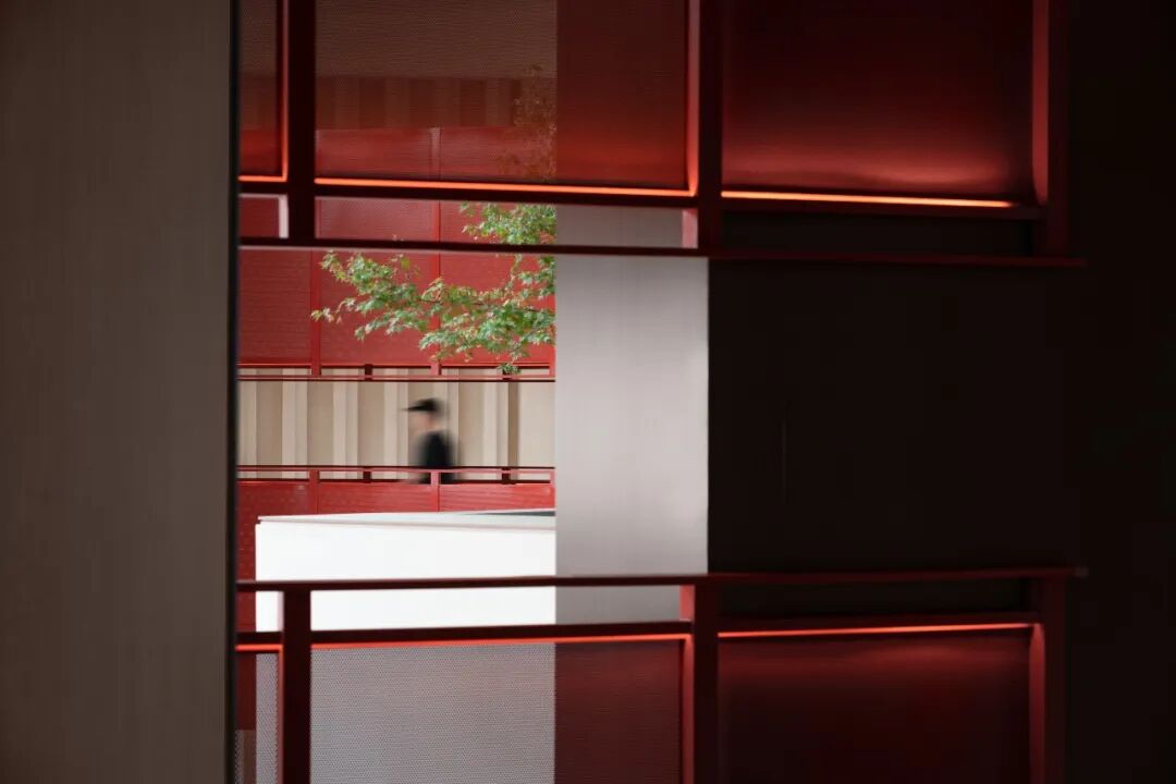 The negotiation area emphasizes the visual texture and strong material aesthetic feeling through the collocation of color, texture and luster. Using the light and shadow transformation of lighting media to create an artistic atmosphere, a large area of red metal mesh material enriched the hierarchical relationship of the whole space.