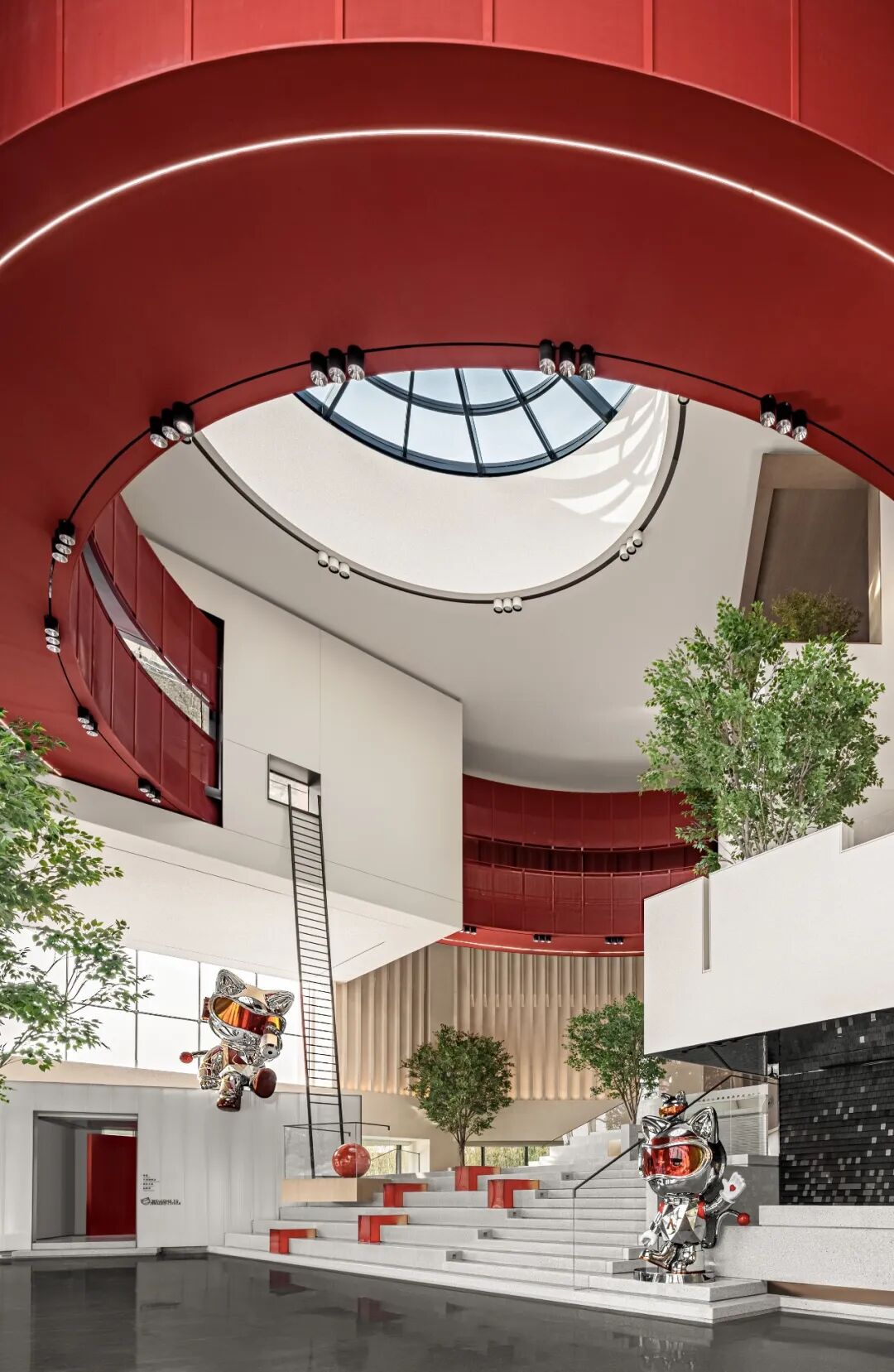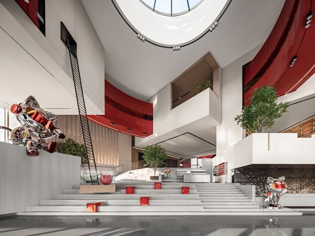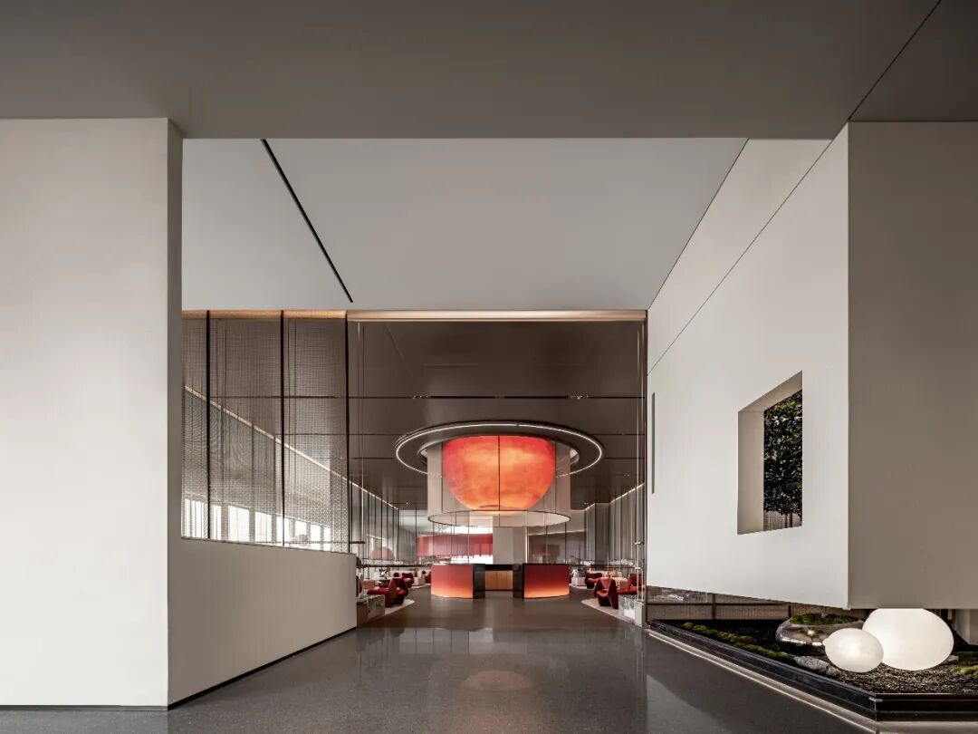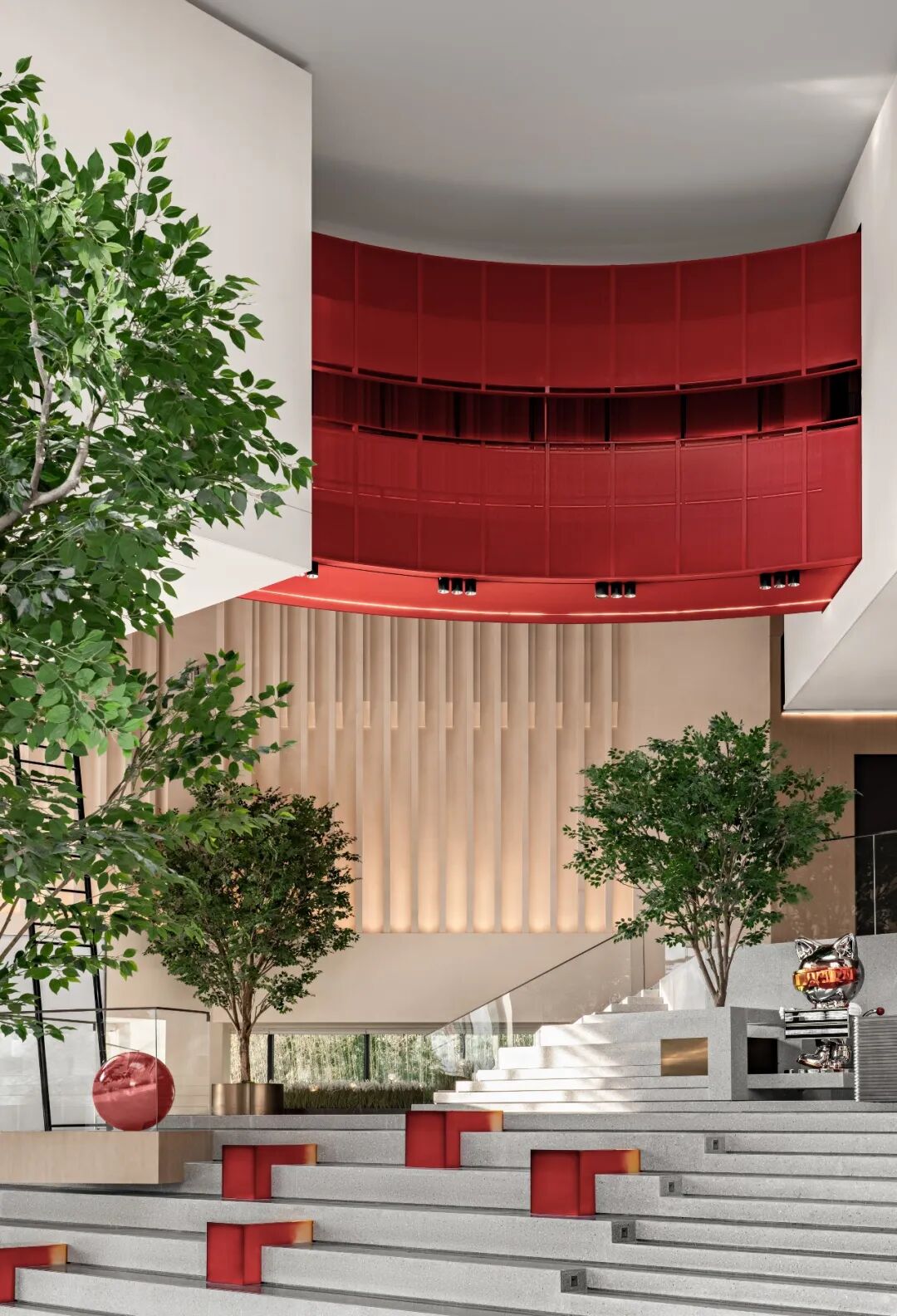 东方色彩“丹砂”作为主色,传承东方的独特气韵与审美,呈现出一个沉浸式艺术化的售楼处,是情感与归属感的诉求。自然景观遍布其中,张弛有度的空间布局巧妙地调和视觉节奏。