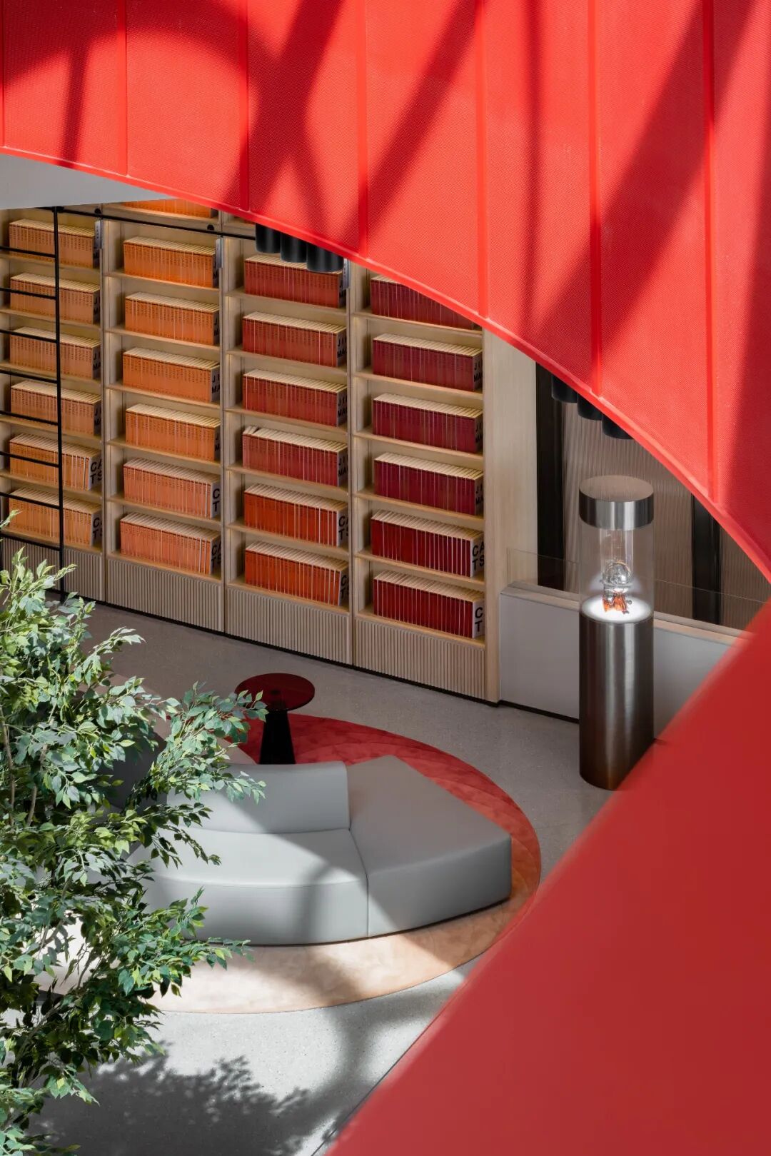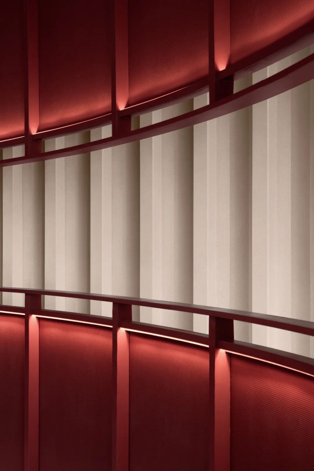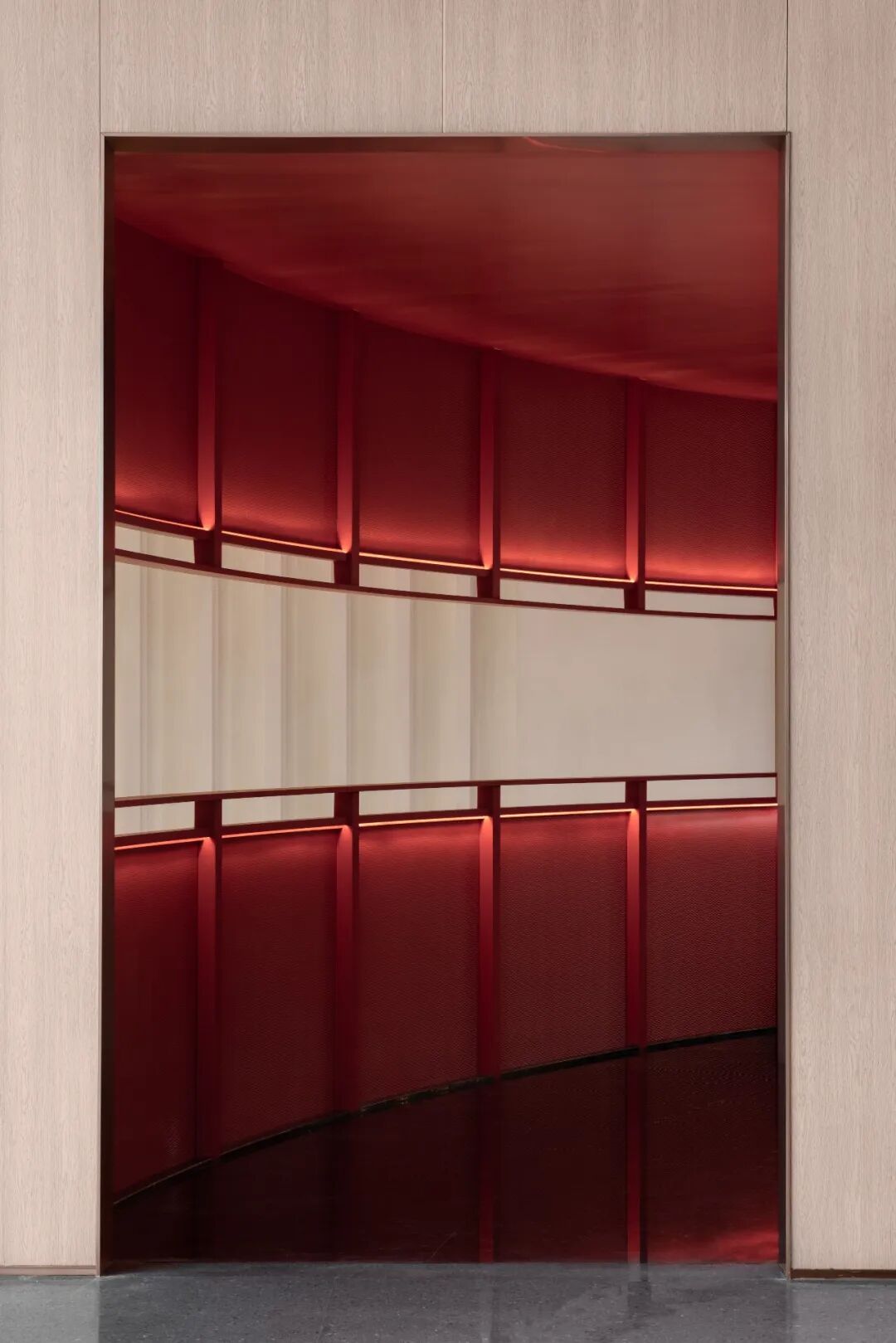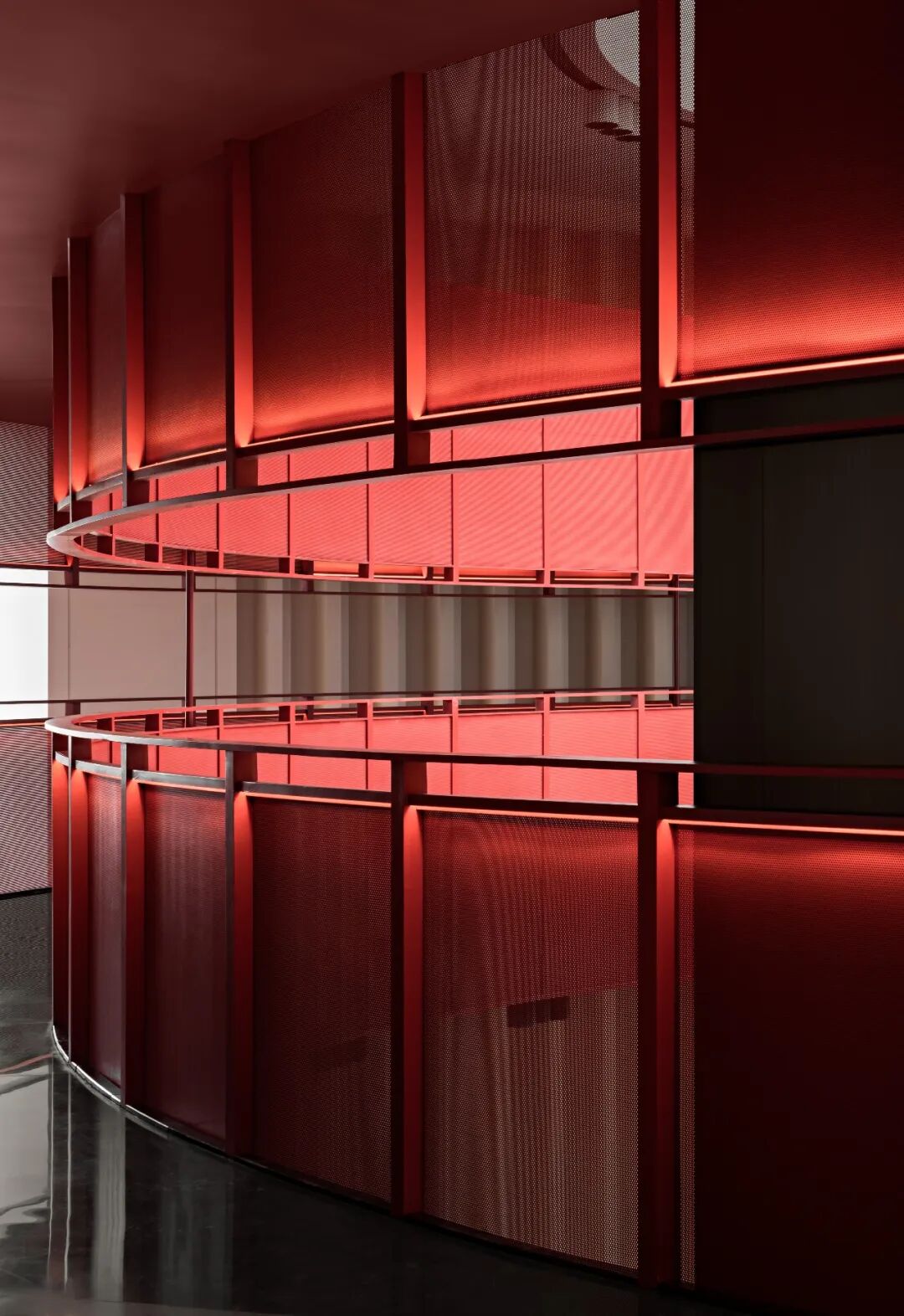 洽谈区通过设色、肌理﹑光泽的搭配,强调视觉质感与强烈的材质美感。运用灯光媒体的光影变换营造出艺术氛围,大面积的红色金属网材质丰富整个空间的层次关系。