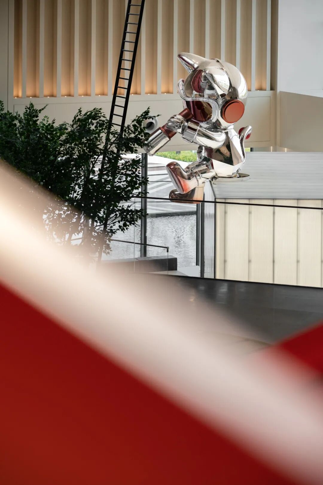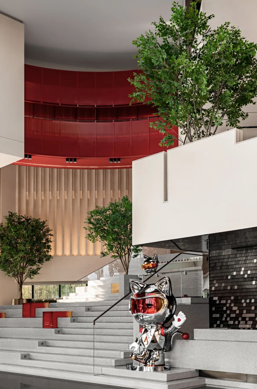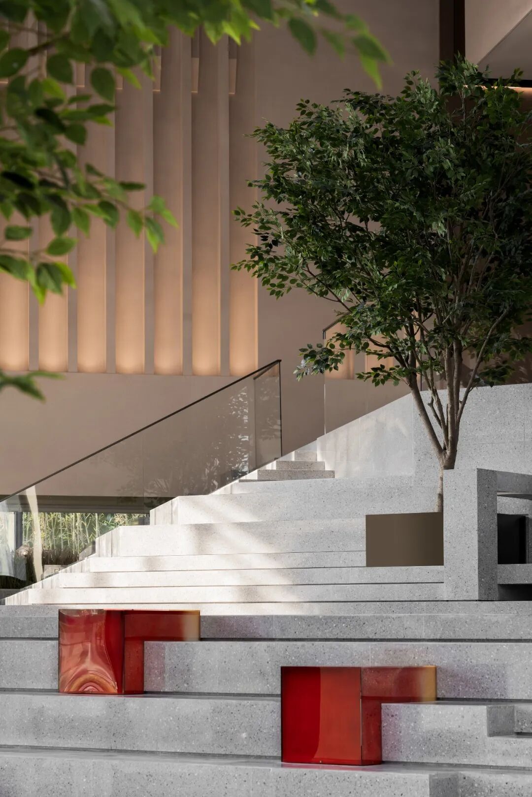 造型简括的景观艺术楼梯在“红”与“灰”的呼应间折射出经典的意味,创造平静、时尚又愉悦的氛围感。