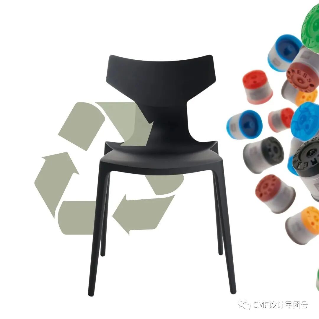 可回收材料的种类与配比是较为灵活的,基材包括生活废弃物、边角料、工业废料、废弃塑料、回收金属等等,按照一定的比例进行回收再利用。种类多样,包括塑胶、金属、玻璃、织物、纸张、木材、羊毛、棉花等,在家具领域中多用于座椅、沙发等产品。