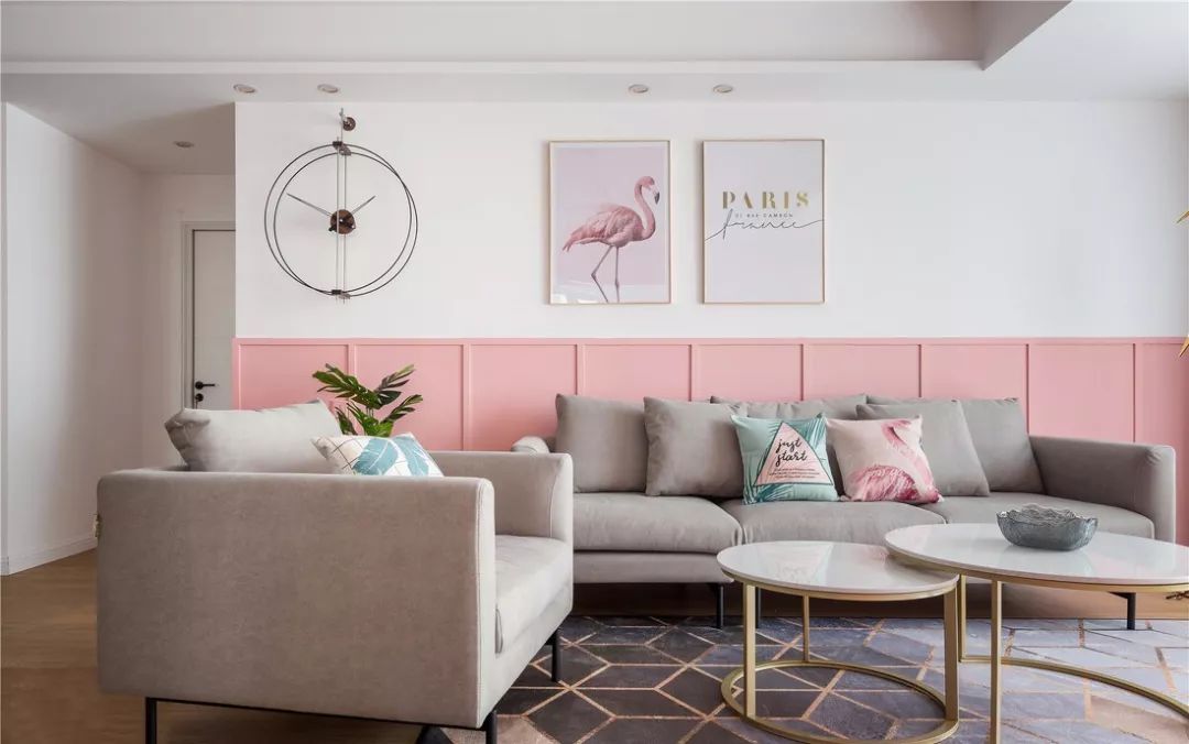 还可以通过护墙板来把沙发背景墙分成两个区域,提升小户型空间内的层次感,粉色与金属元素的结合让人感觉非常优雅精致。
