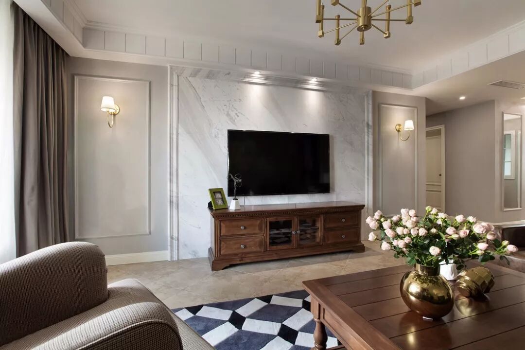 电视背景墙可以直接铺上一大块的大理石瓷砖,然后左右两侧刷上乳胶漆,搭配对称的石膏线边框和壁灯、挂画等,让人感觉简洁而又大方。