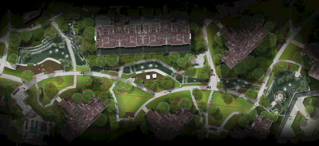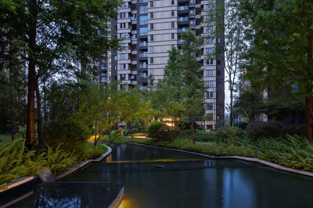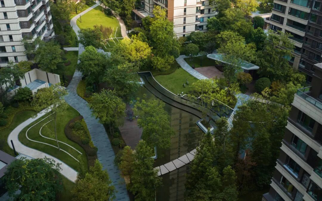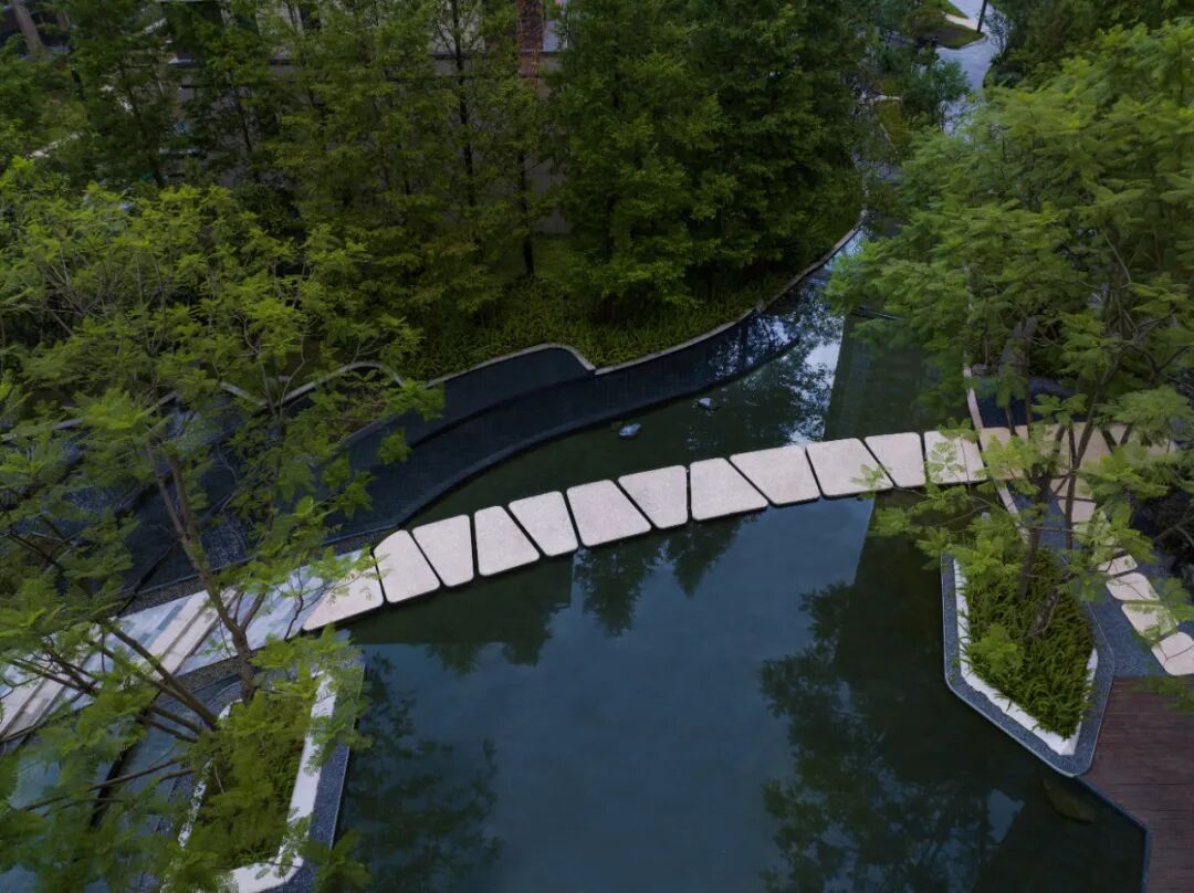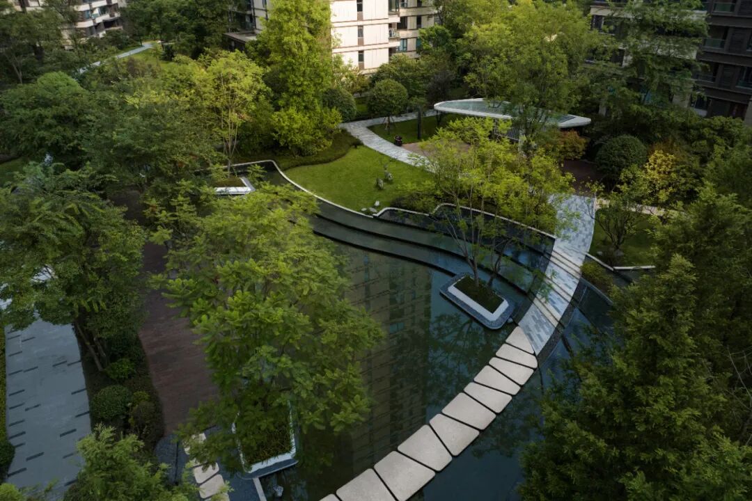 两江四岸嘉陵江畔,天阅嘉陵面江。但场地临江面较窄,江景资源有限;设计有意识地将一条溪流引入场地内部,用内部造景的形式来实现扩展场地对江景的深度述求,犹如一种“临望嘉陵江,如在江上游”的概念。